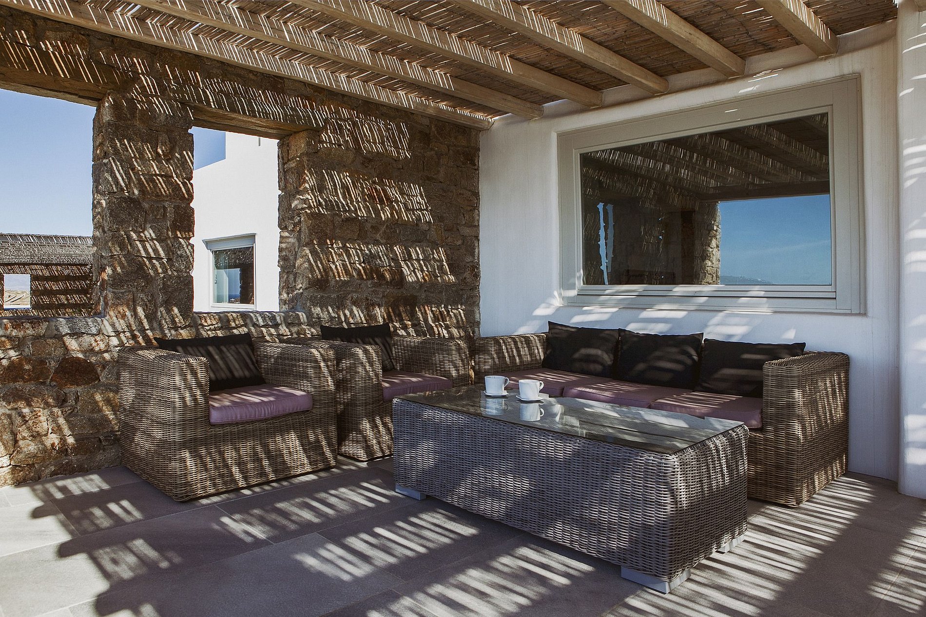 The modern decor blends with traditional architecture for a luxurious Greek holiday. The villa has four spacious bedrooms and can accommodate up to 8 people. The interior consists of a modern, fully equipped kitchen, spacious dining area, and living room with windows and doors. The large covered outdoor terrace commands a spectacular view which you can enjoy seated in the comfortable outdoor living area.