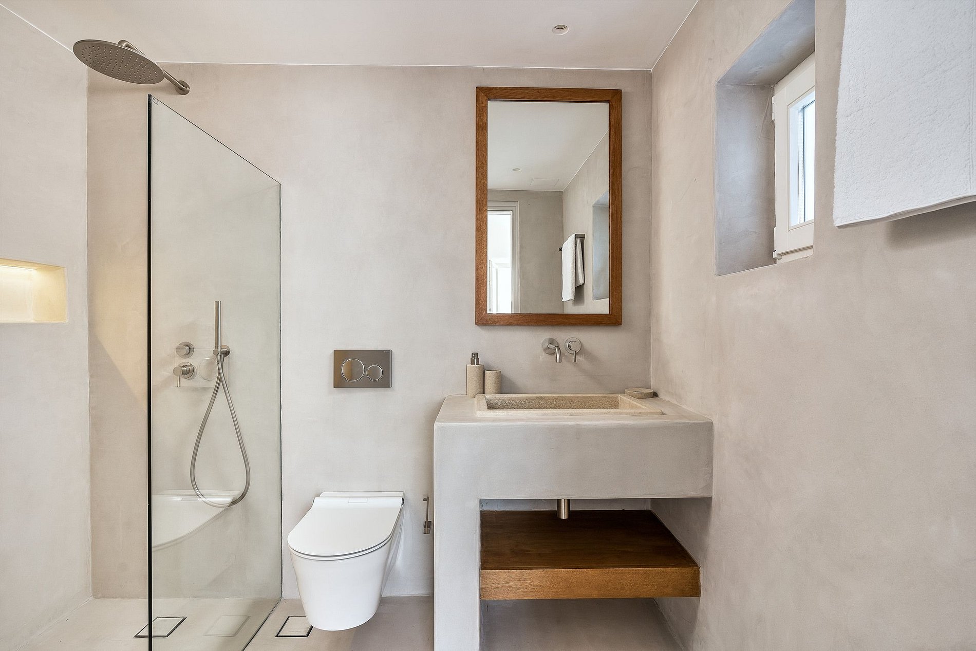 The Interior with the traditional white walls is warmed by the golden wood of the flooring and the high ceilings with visible beams. The large bay windows of the living room and the bedrooms let the sun spread over the sofas and the beds. All bedrooms have unobstructed sea views while all 3 levels have their own patios/terraces and direct access to the pool.