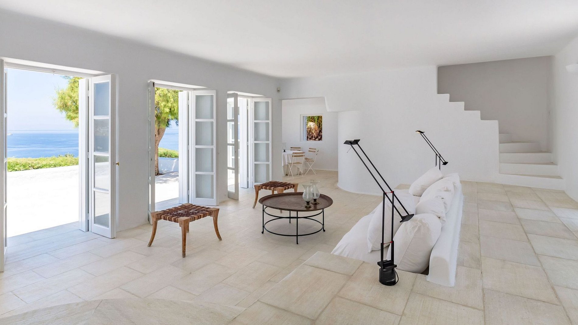 This villa with a minimal type design is located just above the old harbor of Mykonos and surrounded by over 60 olive trees. A path of white stones leads guests to a built-in shaded pergola along the olive grove, allowing pleasant al-fresco dining. Only a three-minute walk to the old town, the villa is located in the middle of a large garden and overlooks the harbor, the islands of Rhenia, Syros, and Tinos.