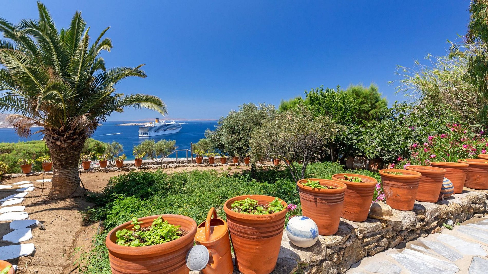 This villa with a minimal type design is located just above the old harbor of Mykonos and surrounded by over 60 olive trees. A path of white stones leads guests to a built-in shaded pergola along the olive grove, allowing pleasant al-fresco dining. Only a three-minute walk to the old town, the villa is located in the middle of a large garden and overlooks the harbor, the islands of Rhenia, Syros, and Tinos.