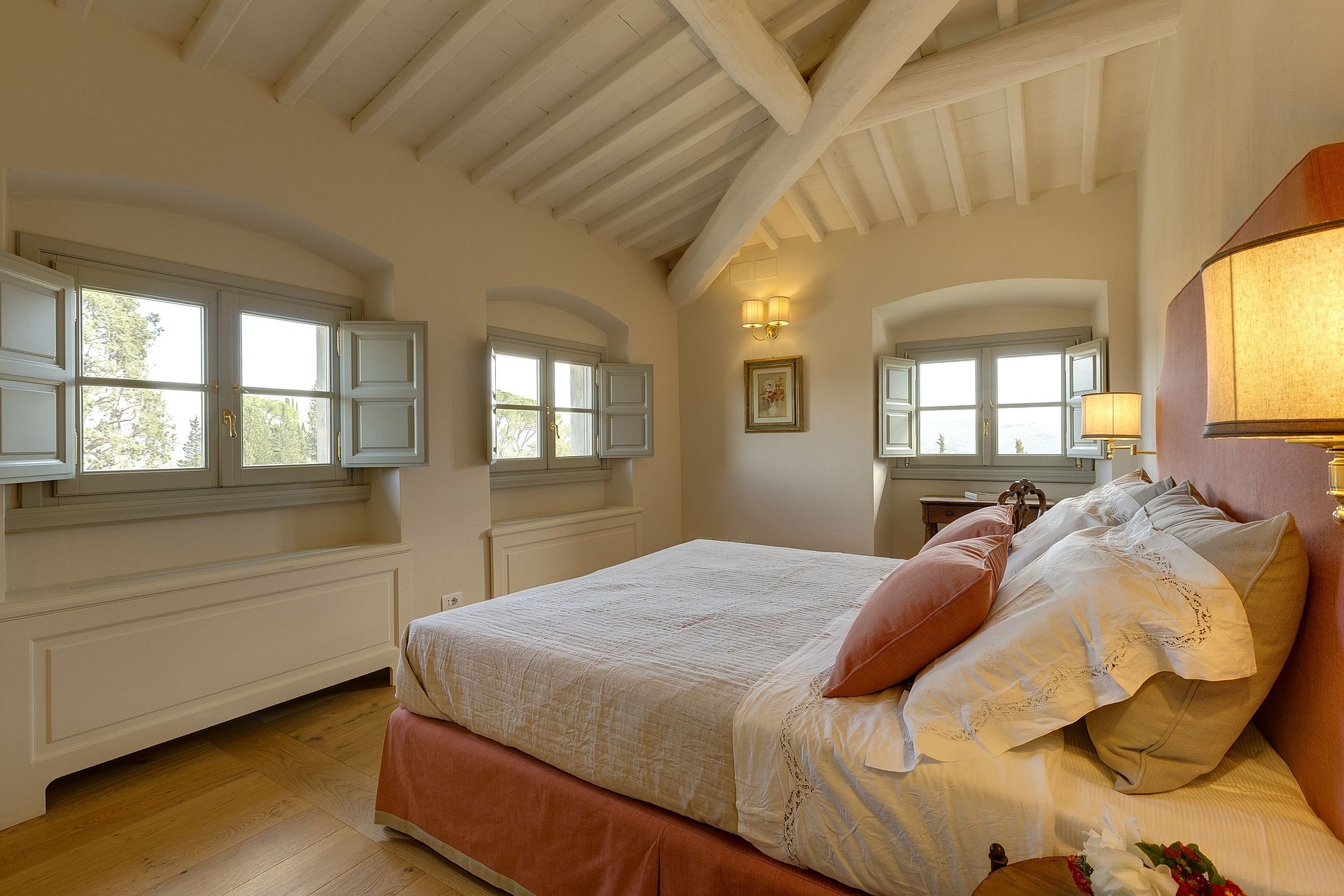 A perfect getaway estate, located south of Florence in the heart of Chianti’s countryside, enjoy the unique experience of the relaxing atmosphere of the Tuscan countryside, surrounded by the famous rolling green hills lined with cypresses and embraced by 30 acres of vineyards, olive groves, forest and a lake. You will be amazed as you appreciate the harmonious relationship between nature of Tuscany and the magnificent living spaces. The interior spaces are rich with local history and the large windows allow unforgettable timeless views