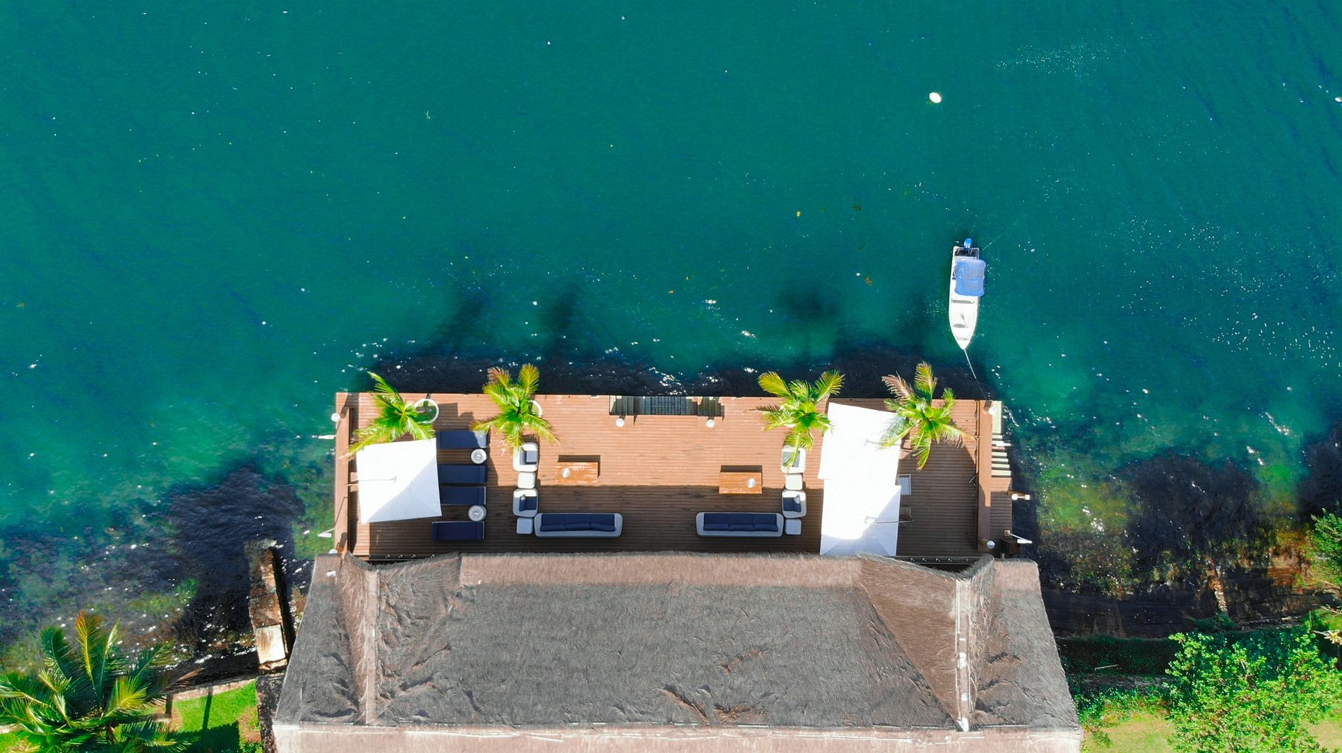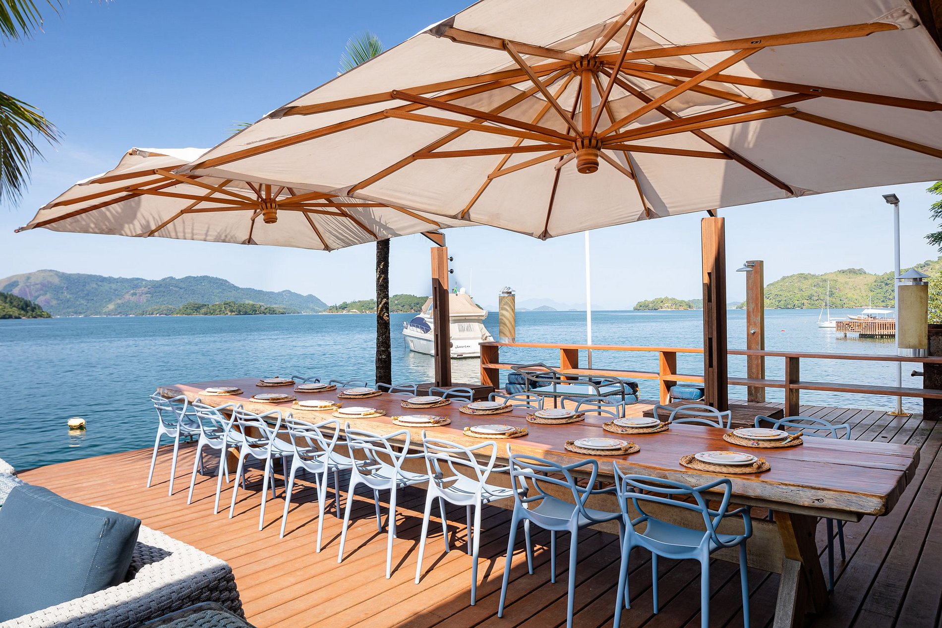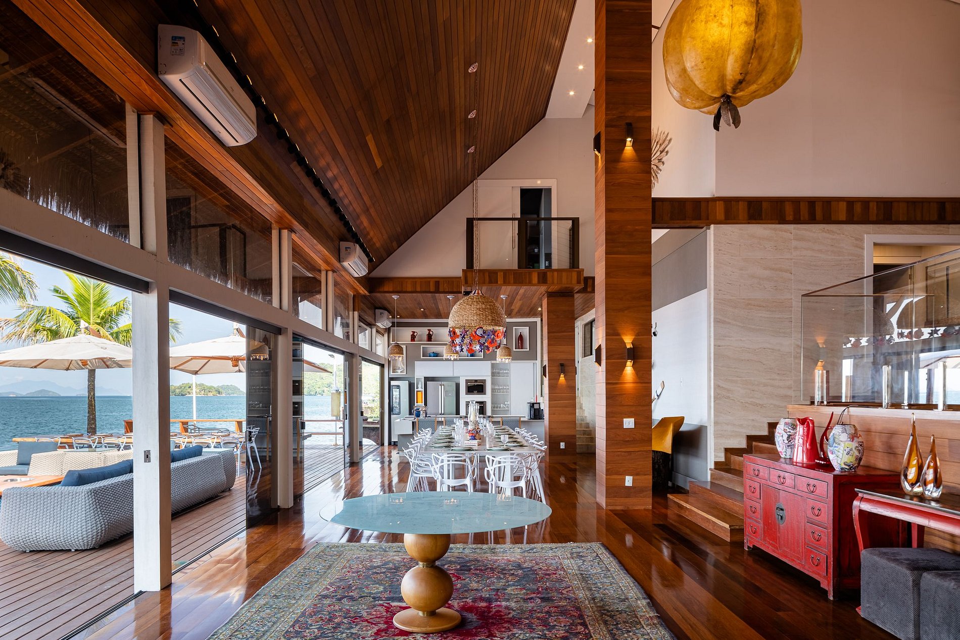 The beautiful experience of staying in this house starts at Marina Costabella where a boatman waits for the guests to take them to the house, passing near Praia do Pontal, in a few minutes trip to the house on the island. The entrance to the house is through the pier where there is a large space with sofas to adorn the landscape, sun loungers for sunbathing and a large outdoor dining table with 16 outdoor seats covered by two large umbrellas.