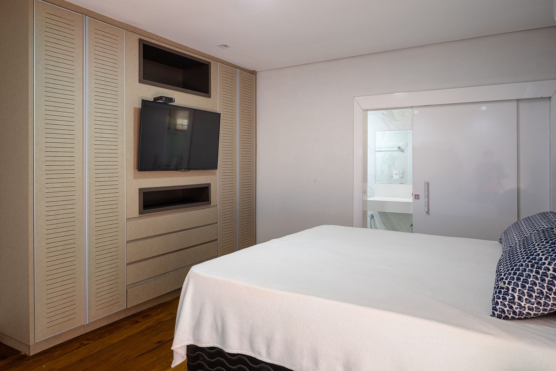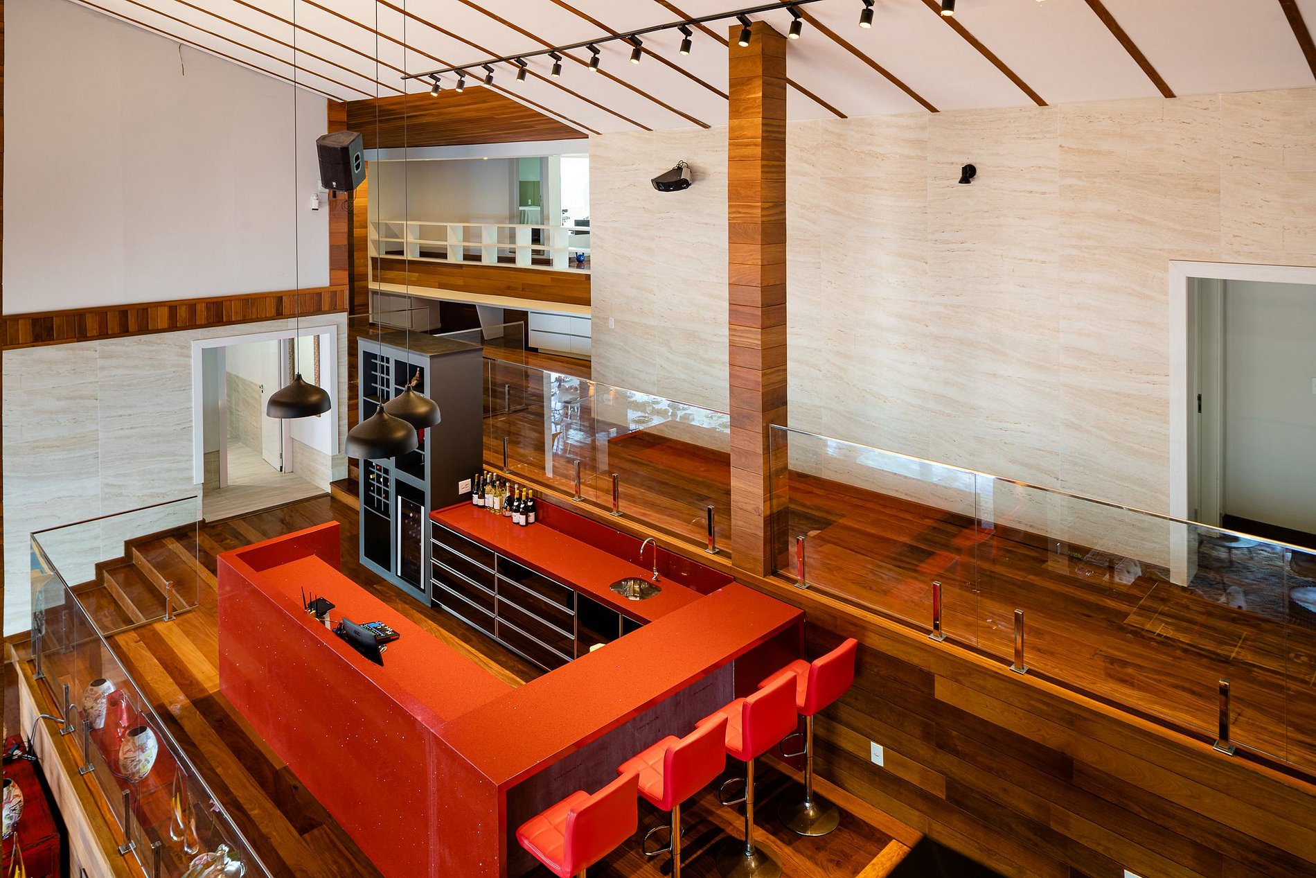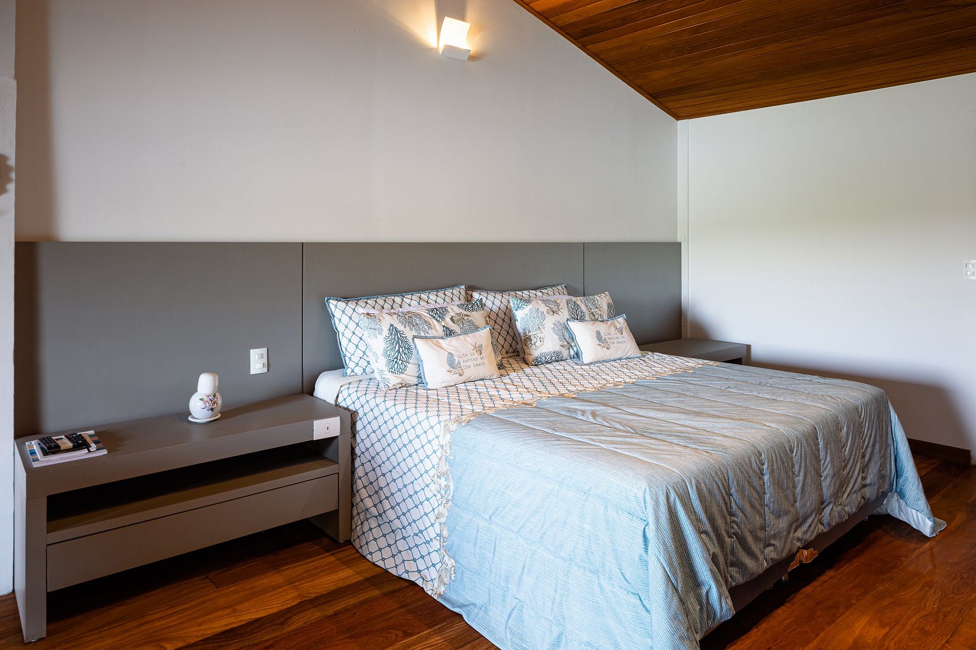 The beautiful experience of staying in this house starts at Marina Costabella where a boatman waits for the guests to take them to the house, passing near Praia do Pontal, in a few minutes trip to the house on the island. The entrance to the house is through the pier where there is a large space with sofas to adorn the landscape, sun loungers for sunbathing and a large outdoor dining table with 16 outdoor seats covered by two large umbrellas.