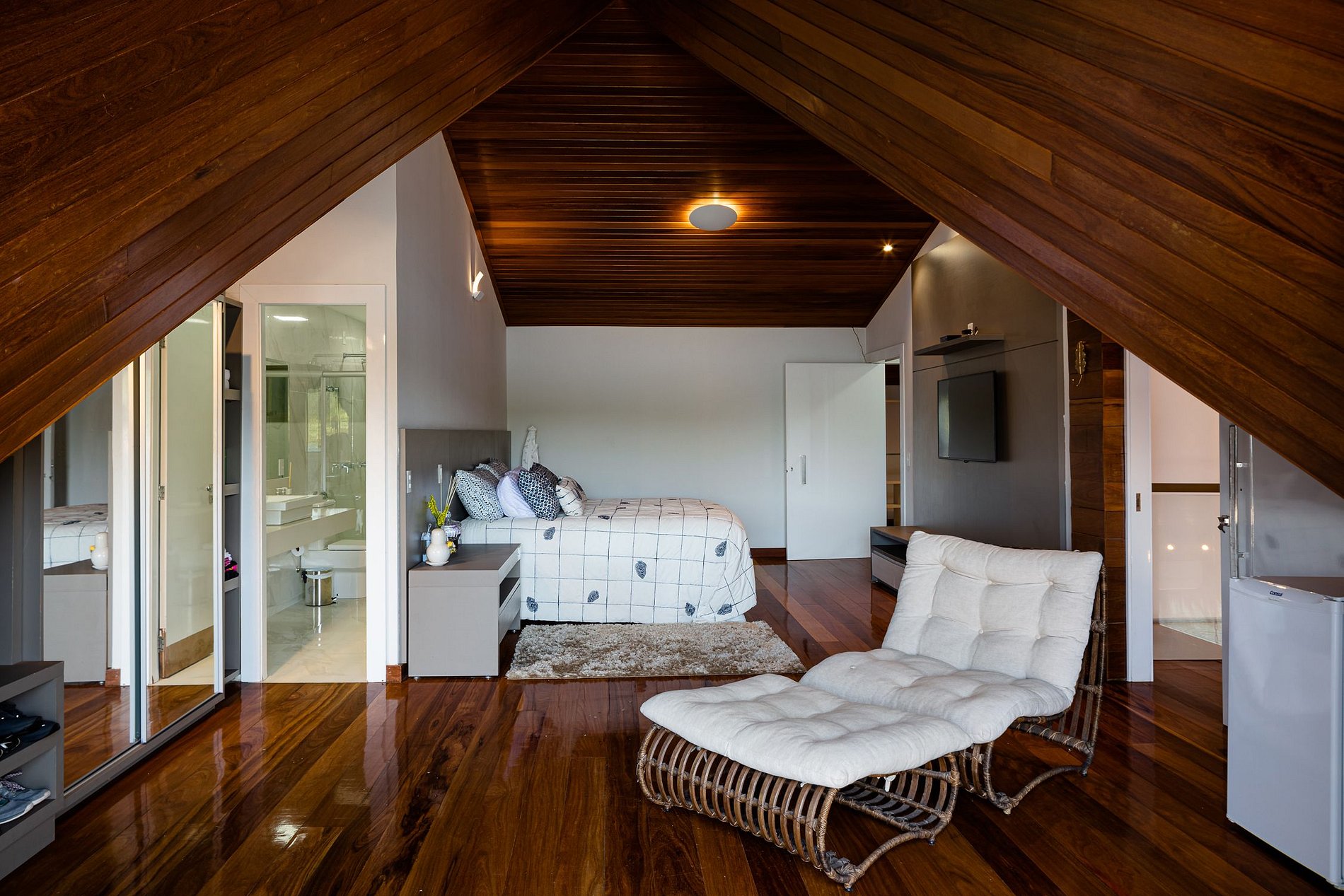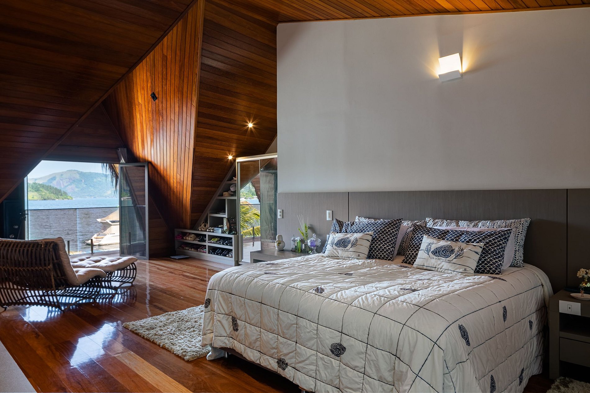 The beautiful experience of staying in this house starts at Marina Costabella where a boatman waits for the guests to take them to the house, passing near Praia do Pontal, in a few minutes trip to the house on the island. The entrance to the house is through the pier where there is a large space with sofas to adorn the landscape, sun loungers for sunbathing and a large outdoor dining table with 16 outdoor seats covered by two large umbrellas.