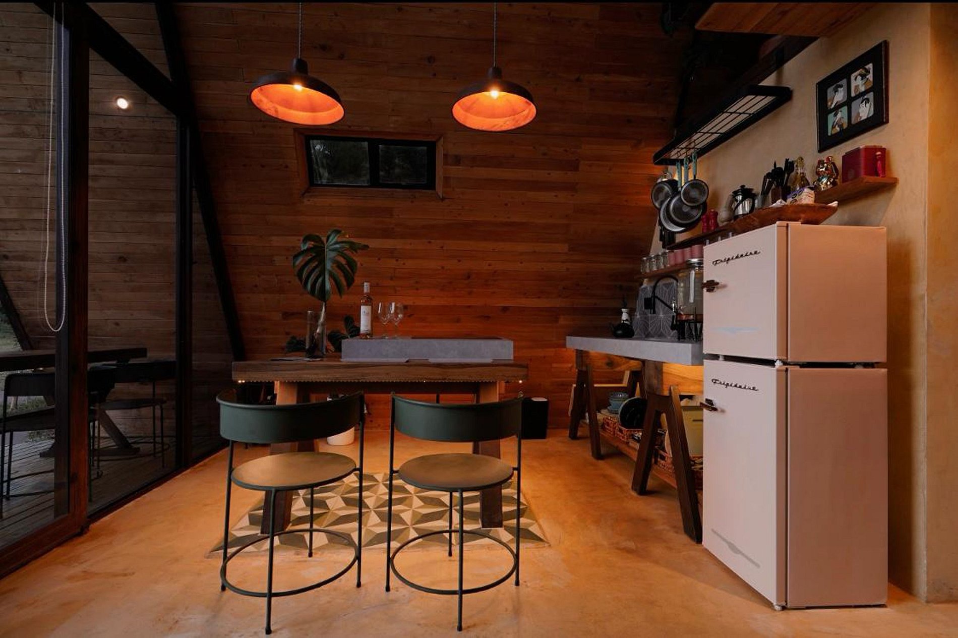 Inside, you’ll find an organic, clean, and modern design that embodies the Japandi style—a harmonious blend of Japanese simplicity and Scandinavian functionality. With a glass roof that floods the space with natural light, you can stargaze from the comfort of your living room or cozy up in front of the wood-burning fireplace with a game of chess.