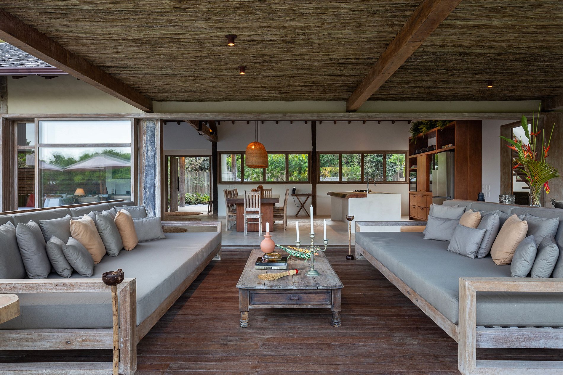 The living and dining rooms are integrated spaces with large windows that allow natural light to flow in, connecting guests to the outdoor environment. With elegant furniture and décor reflecting the rustic-chic style typical of Trancoso, these spaces are perfect for socializing and enjoying meals with a sea view. The house also offers ceiling fans, premium bedding, and outdoor dining tables, creating an atmosphere of comfort and elegance.