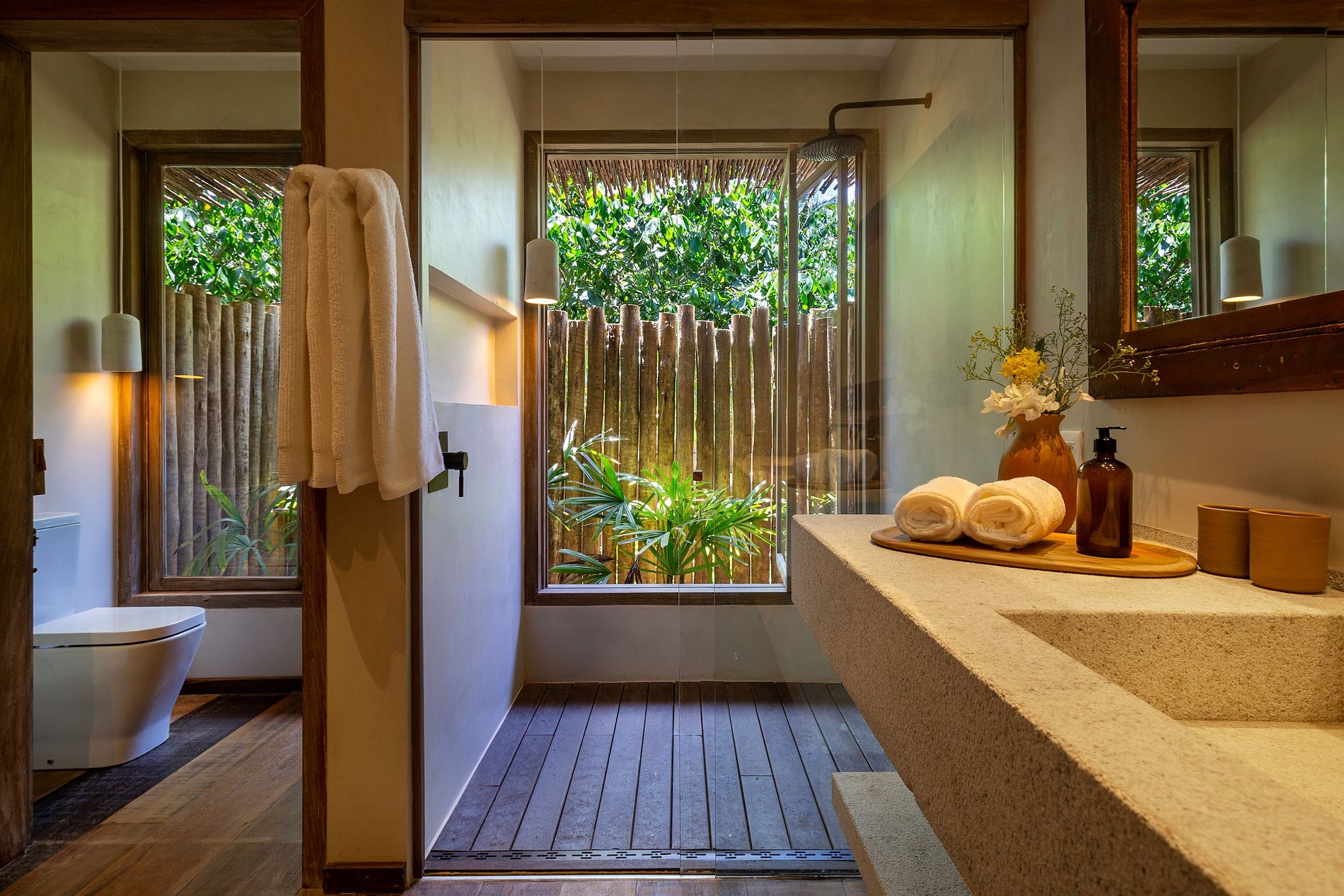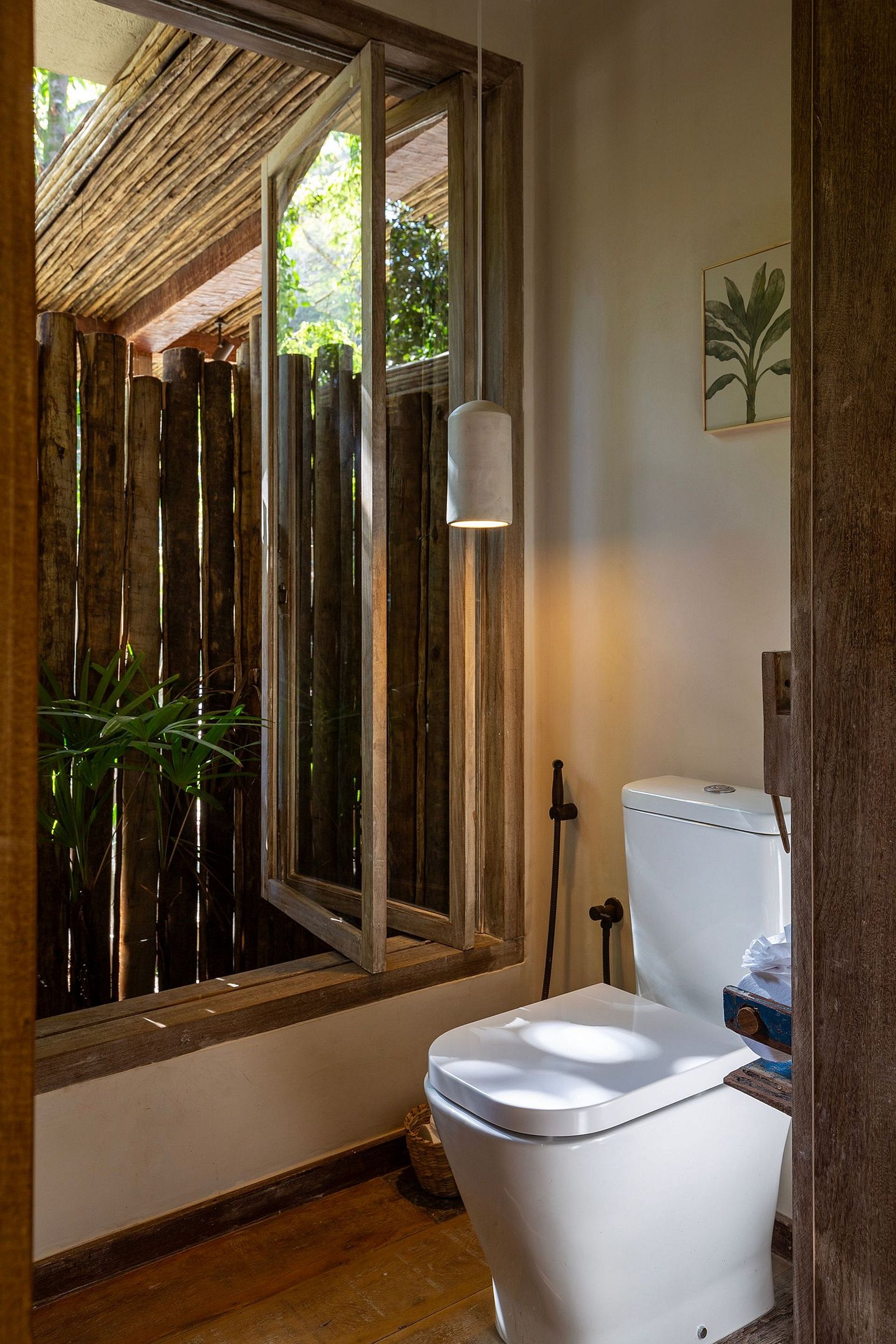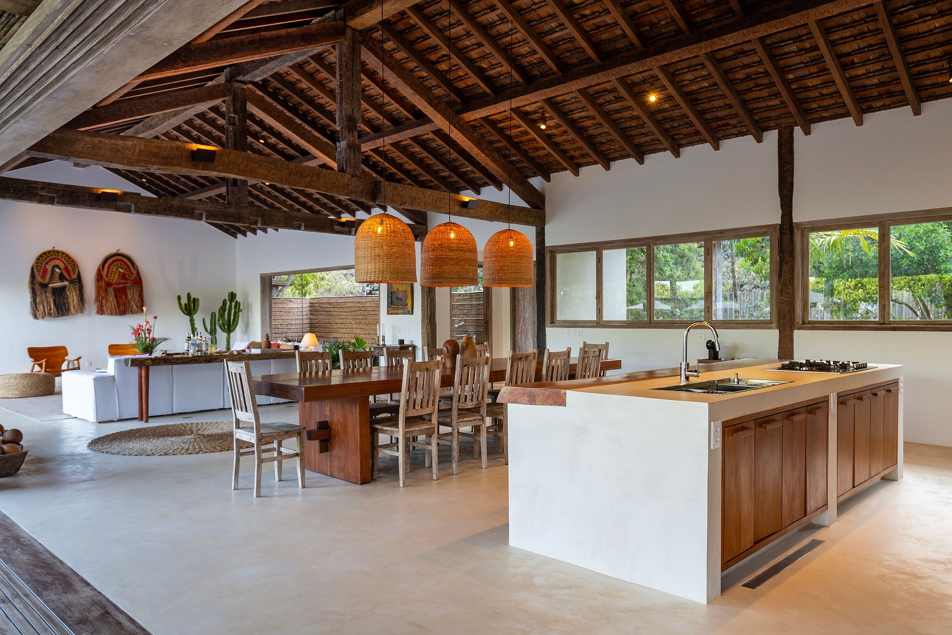 The living and dining rooms are integrated spaces with large windows that allow natural light to flow in, connecting guests to the outdoor environment. With elegant furniture and décor reflecting the rustic-chic style typical of Trancoso, these spaces are perfect for socializing and enjoying meals with a sea view. The house also offers ceiling fans, premium bedding, and outdoor dining tables, creating an atmosphere of comfort and elegance.