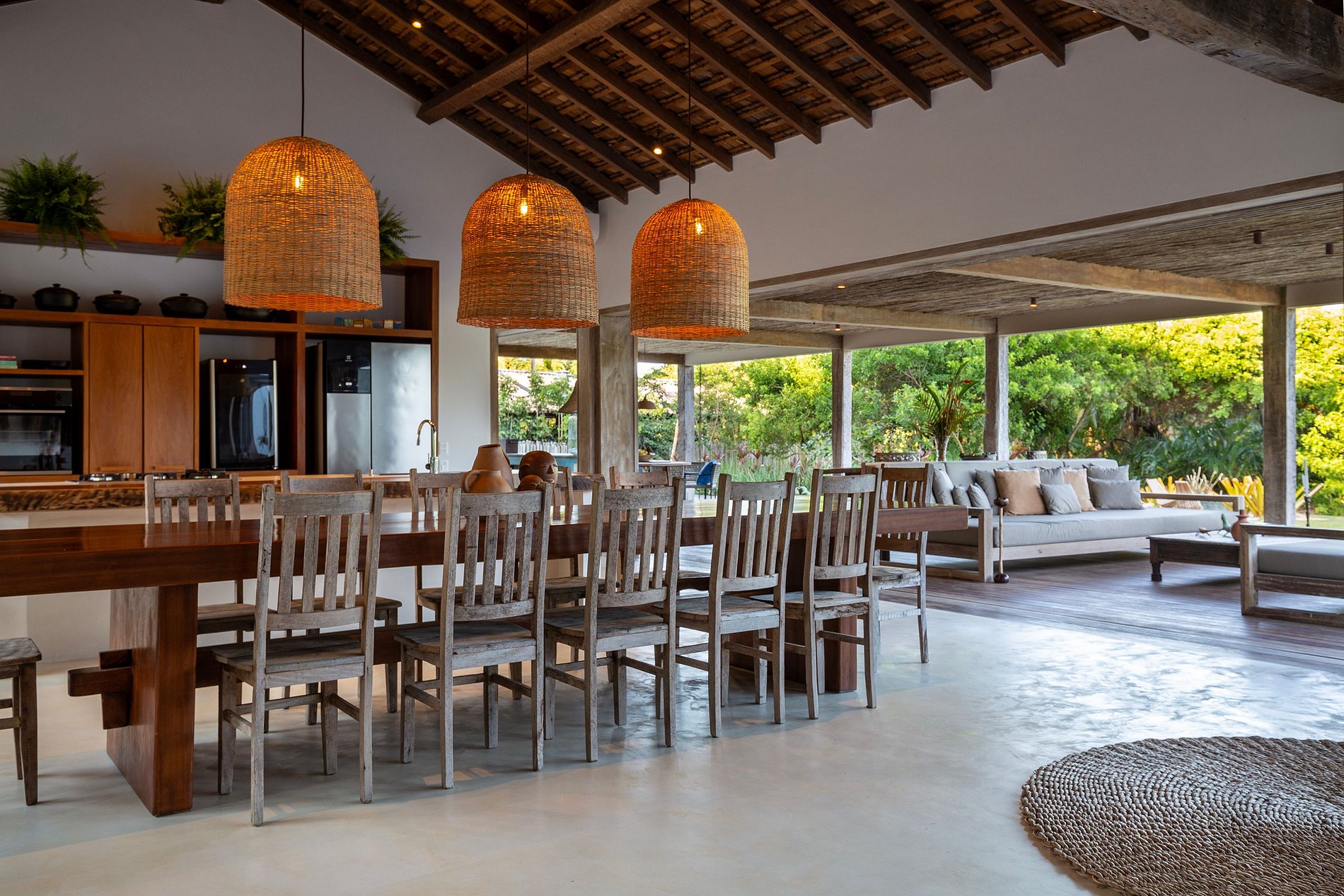 The living and dining rooms are integrated spaces with large windows that allow natural light to flow in, connecting guests to the outdoor environment. With elegant furniture and décor reflecting the rustic-chic style typical of Trancoso, these spaces are perfect for socializing and enjoying meals with a sea view. The house also offers ceiling fans, premium bedding, and outdoor dining tables, creating an atmosphere of comfort and elegance.