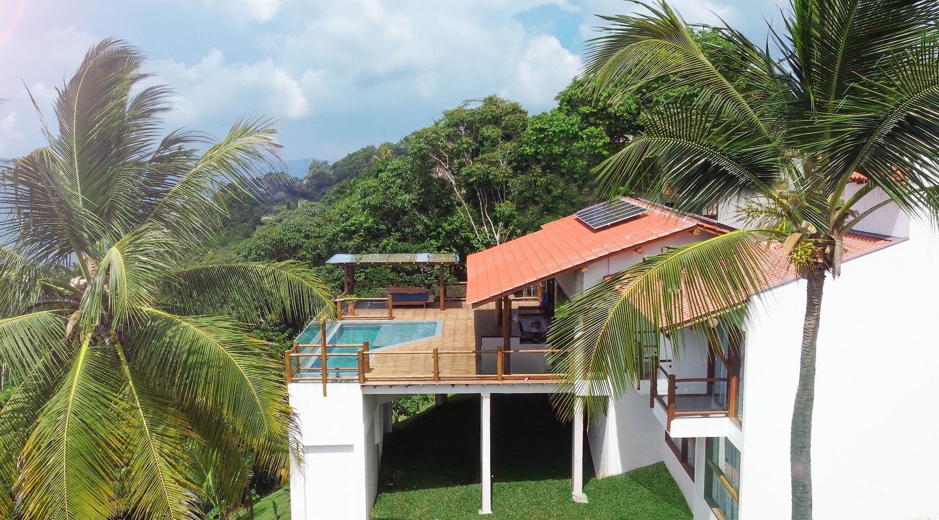 The porch of the house has ample space, ideal for celebrations with friends and family. It has a swimming pool overlooking the sea, to raise all esteem. For leisure and meals, the house also has a barbecue; and a space with sofas and armchairs to rest and enjoy the natural exuberance of the place.