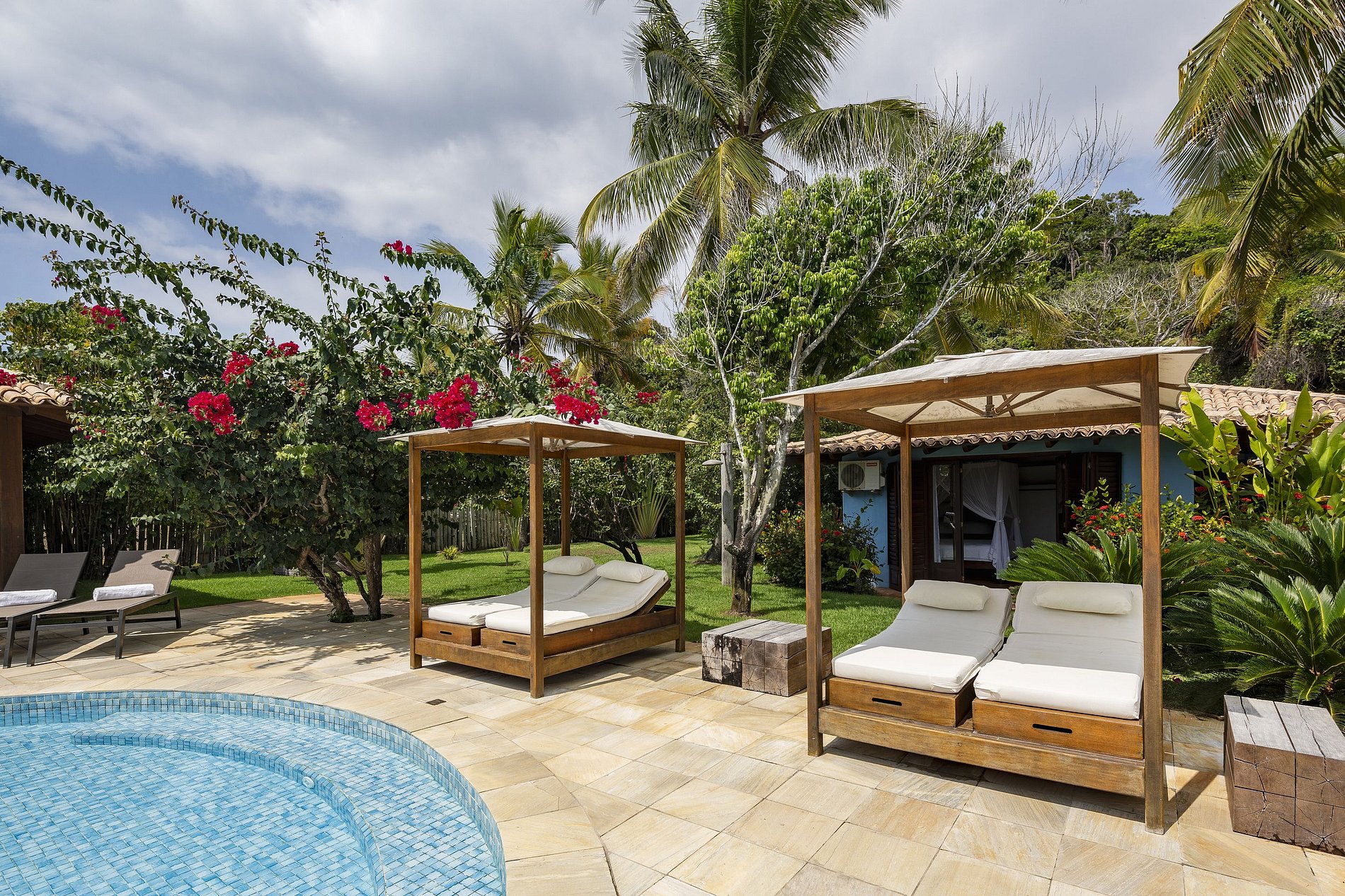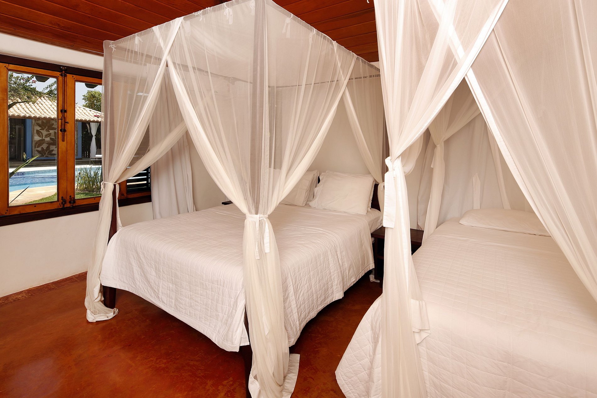 Suite 4 with pool view, with queen size bed and 01 single bed, mosquito net and air conditioning;