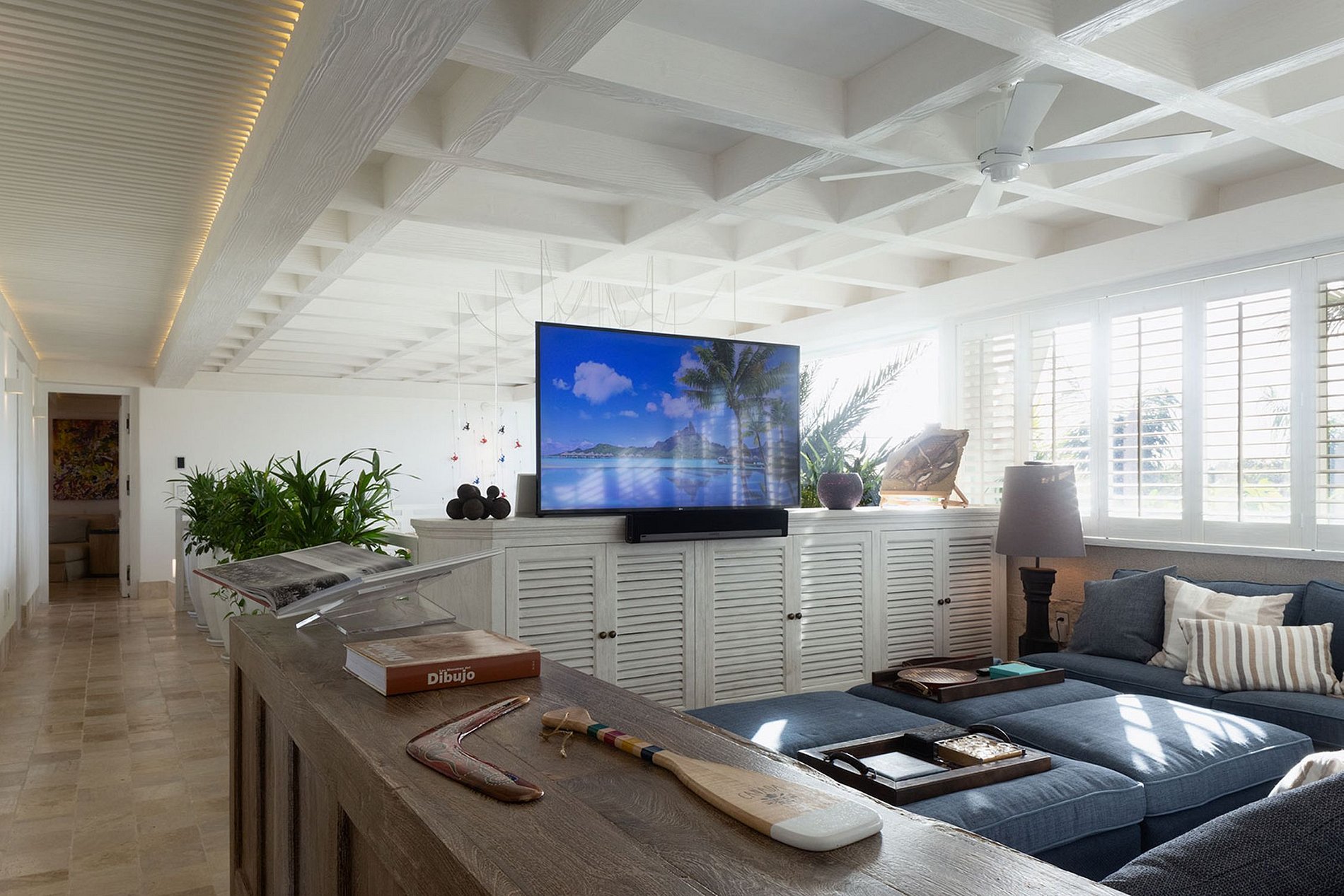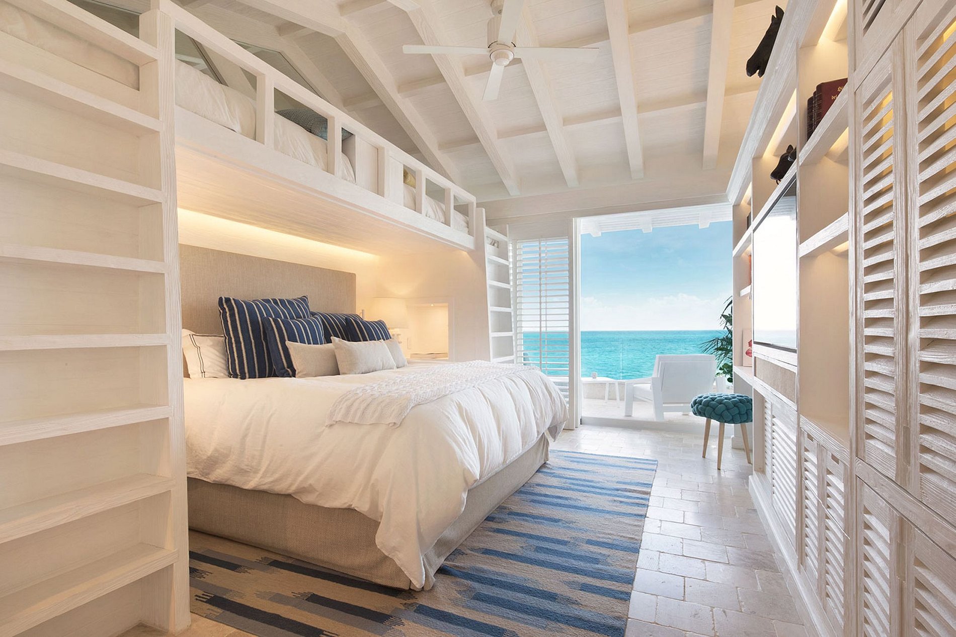 King Size Bed + 2 single loft beds, Air conditioning, Bathrobes, Bathtub, Ceiling fan, Desk, Dual vanity, Ensuite and exterior rainfall showers, Ensuite bathroom, Hairdryer, iPad & smart room, Ocean view, Private balcony, Safety box, Smart TV, Sonos central sound system, Wifi access