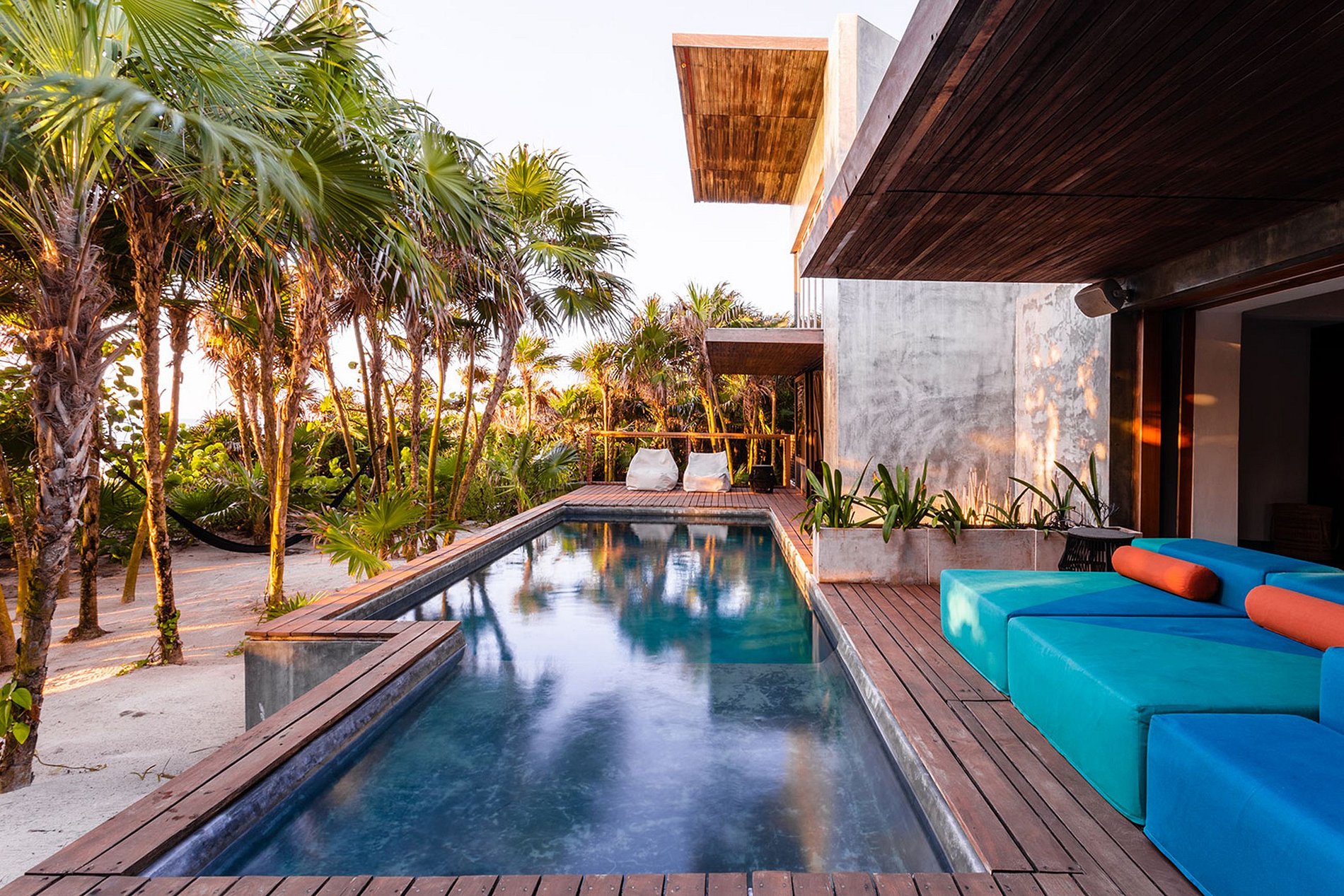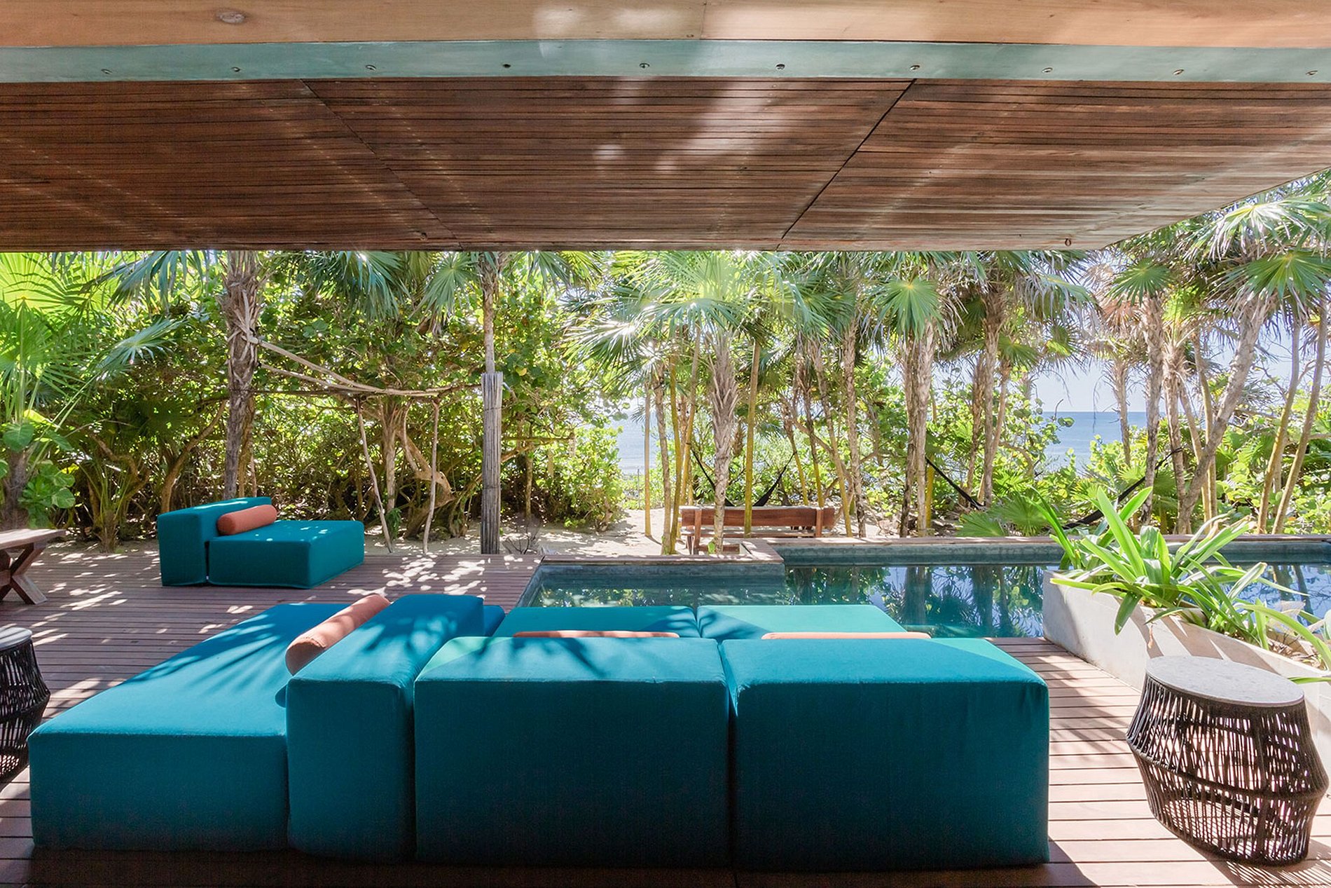 Beyond the main ‘palapa’, the natural dunes, with their palm trees and snug hammocks, are the prelude to a breathtaking private stretch of white sand beach. Climb on to the top level and you will find mesmerizing 360-degree views of the 4.5-acre property, with the lagoon on one side and the Caribbean Sea on the other. The rooftop deck, an ideal spot watching spectacular sunsets, also boasts an infinity pool where you can spend hours relaxing and contemplating the ocean.