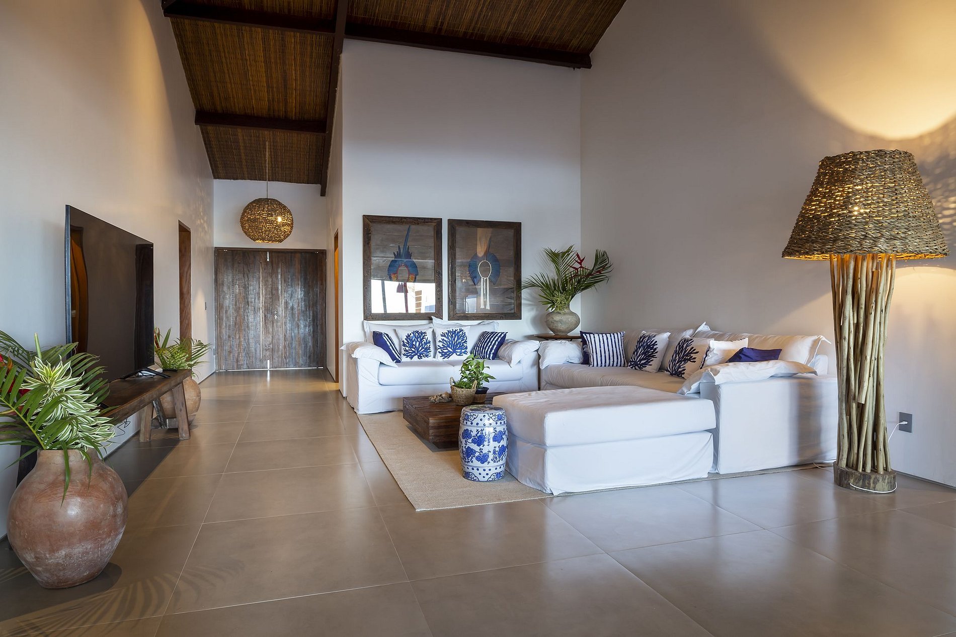 The living room has a wooden dining table with 10 seats, built-in JBL sound system, two living areas, the first with woven wooden sofas with a central table and the second with a TV area with 2 padded sofas and access to the terrace.