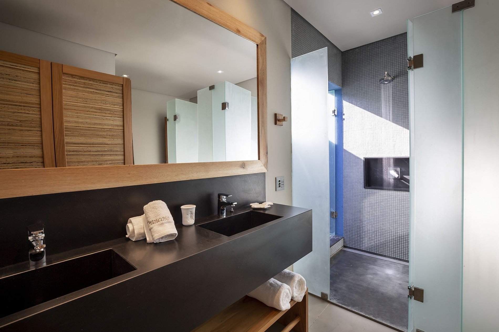 When accessing the house, the corridor gives access to a large air-conditioned living room with a view of the pool and the beautiful wooded area with the region's beaches in the background.