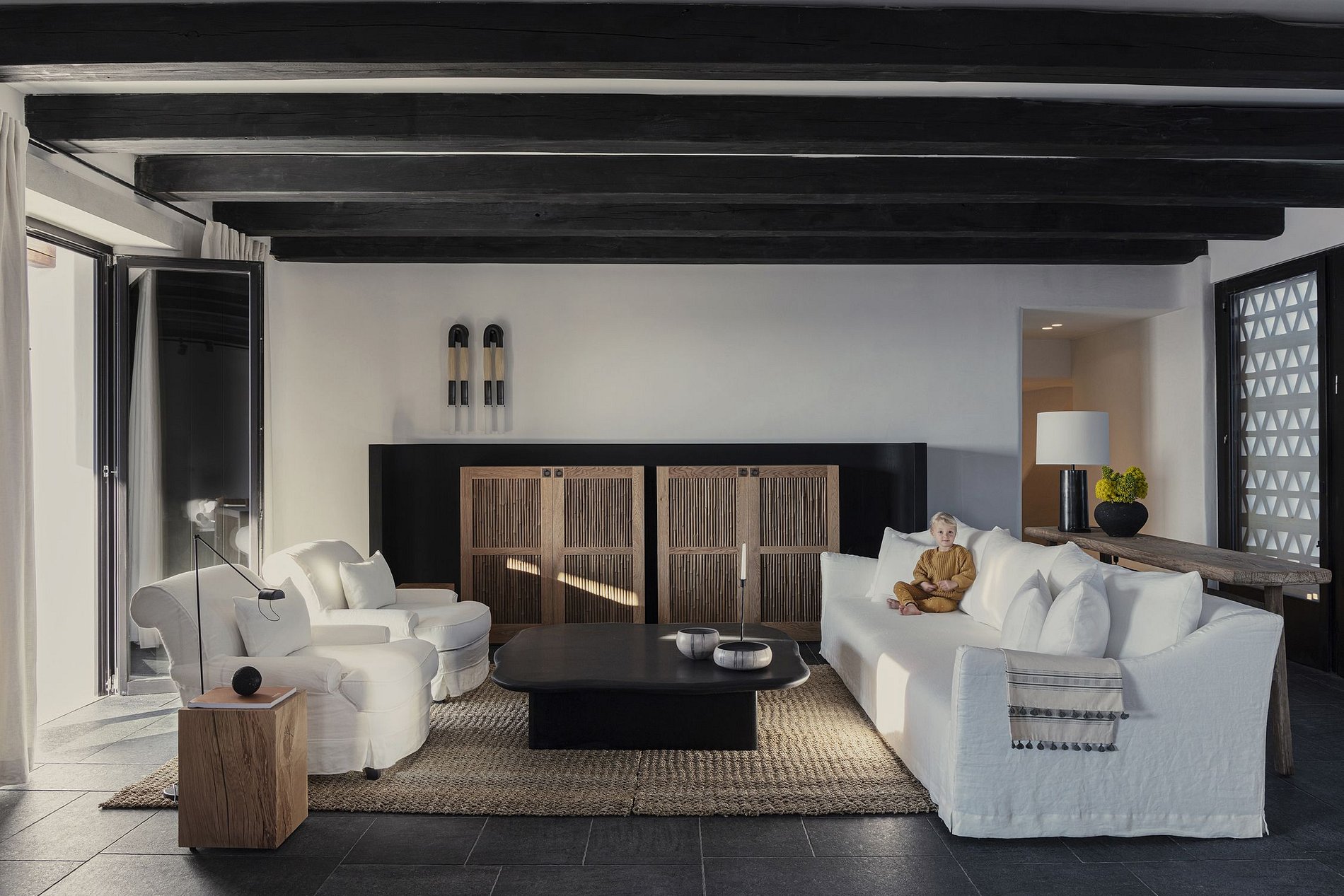 This three en-suite bedroom villa offers glorious sunset views over the island of Delos. The open-plan living room is furnished with cozy sofas and a private dining area with an open, fully fitted kitchen. Guests can gather in the spacious living area or enjoy the views from the outdoor infinity-edge heated swimming pool. The villa includes its own Techno Gym fitness room.