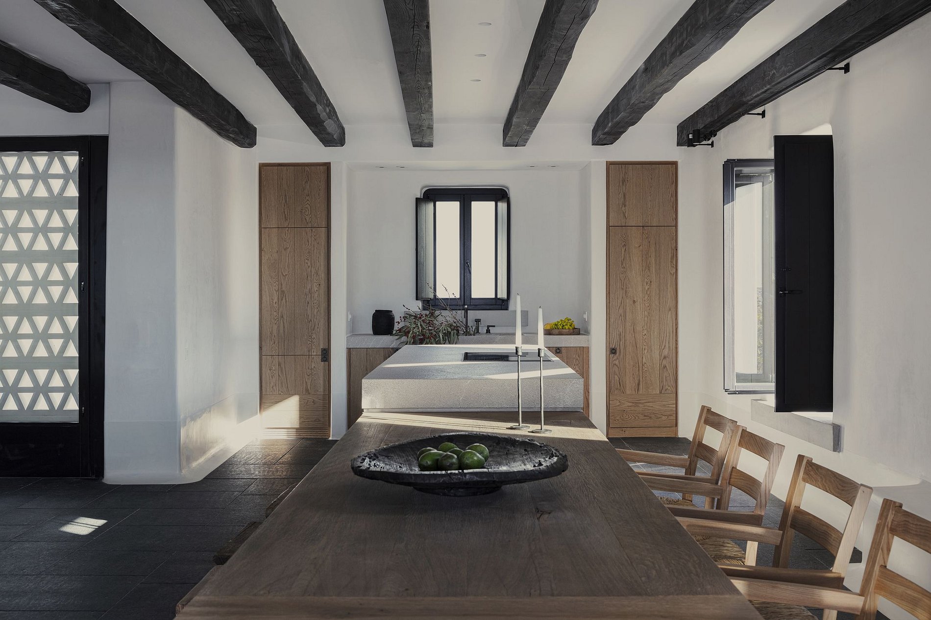 This three en-suite bedroom villa offers glorious sunset views over the island of Delos. The open-plan living room is furnished with cozy sofas and a private dining area with an open, fully fitted kitchen. Guests can gather in the spacious living area or enjoy the views from the outdoor infinity-edge heated swimming pool. The villa includes its own Techno Gym fitness room.