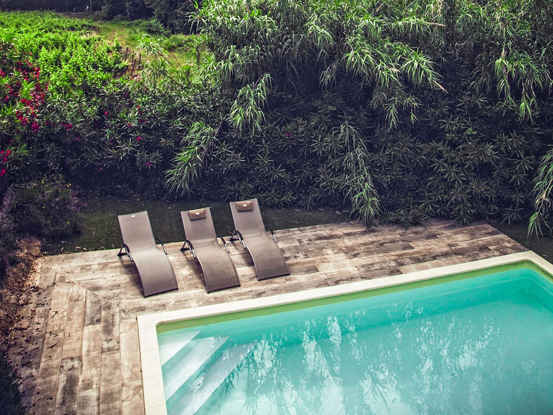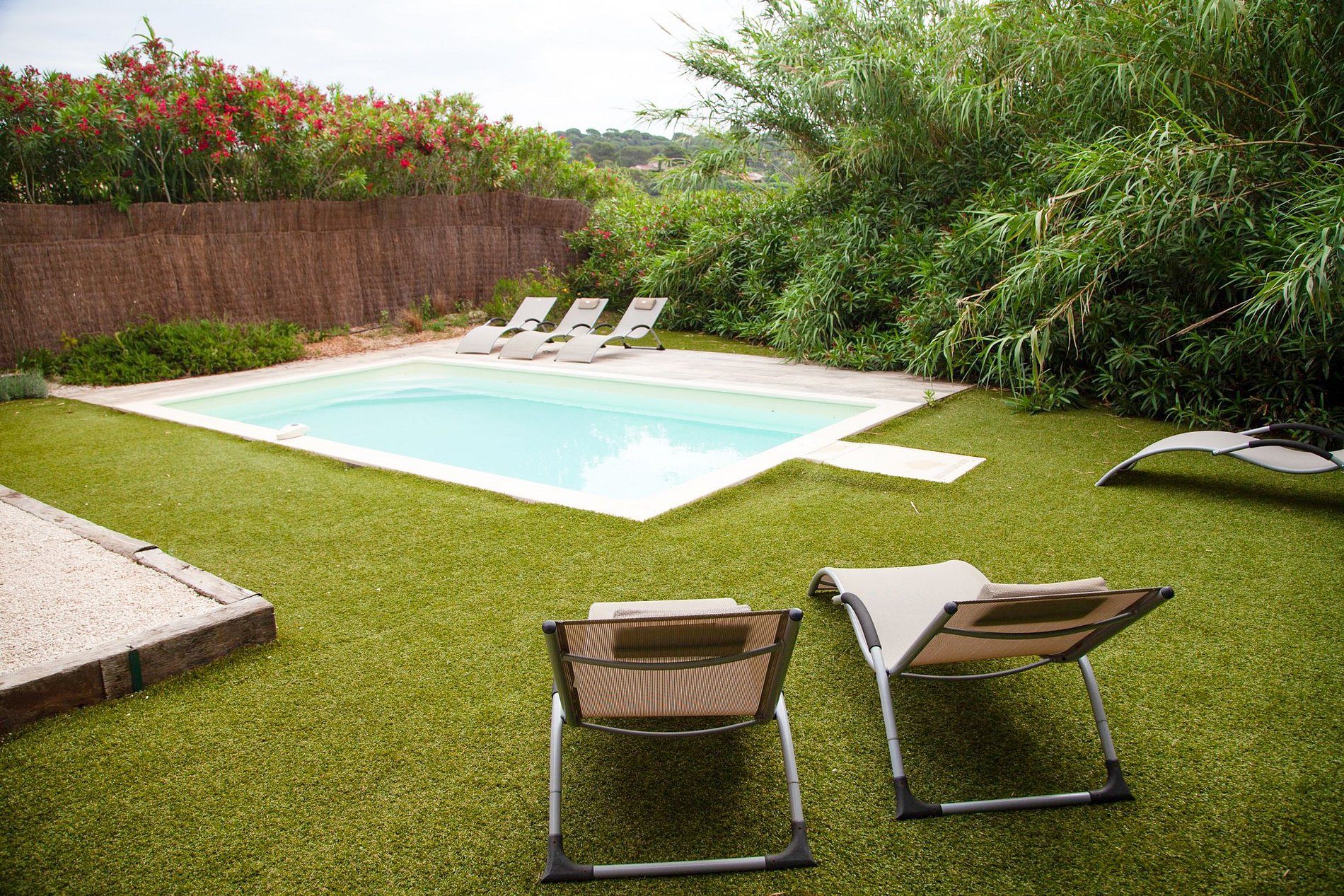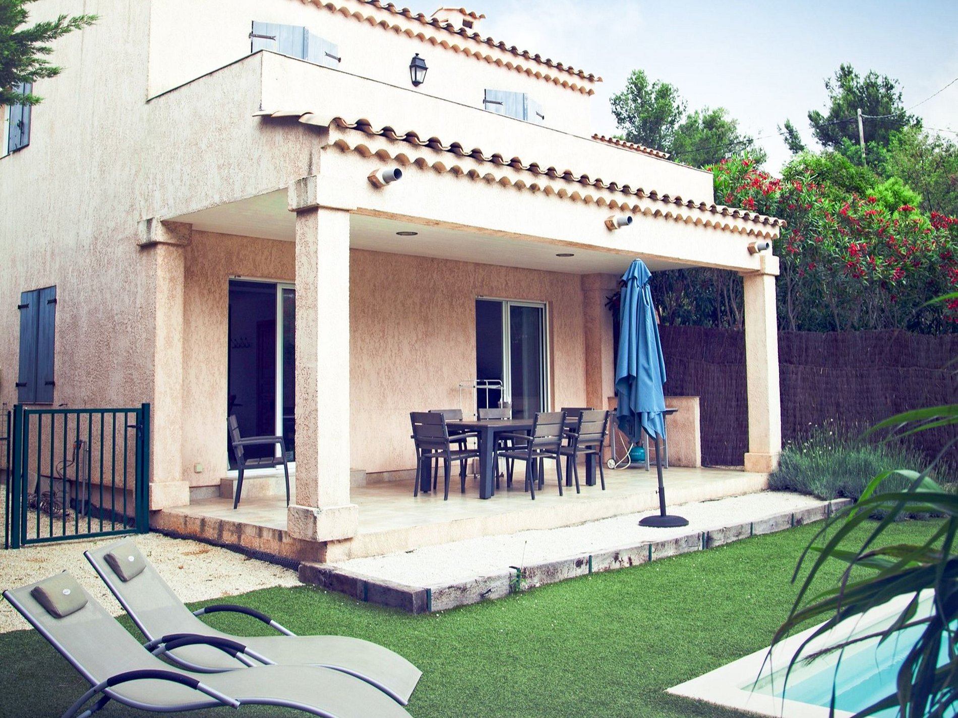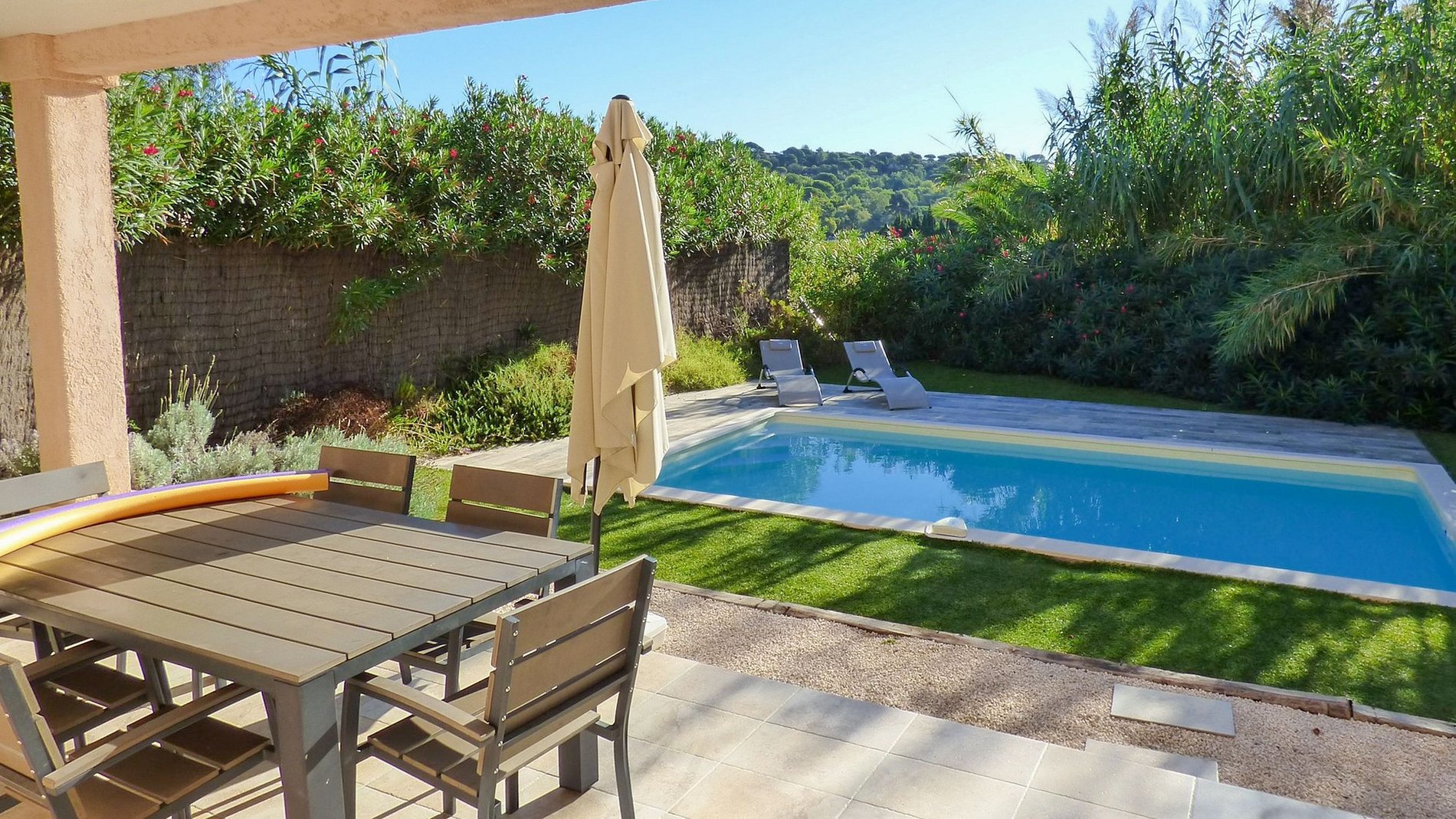 La villa est entourée de magnifiques arbres ce qui permet de bien séparer la propriété des autres maisons et dispose d'un beau jardin avec une grande piscine et de confortables chaises longues pour se détendre au soleil et bronzer.