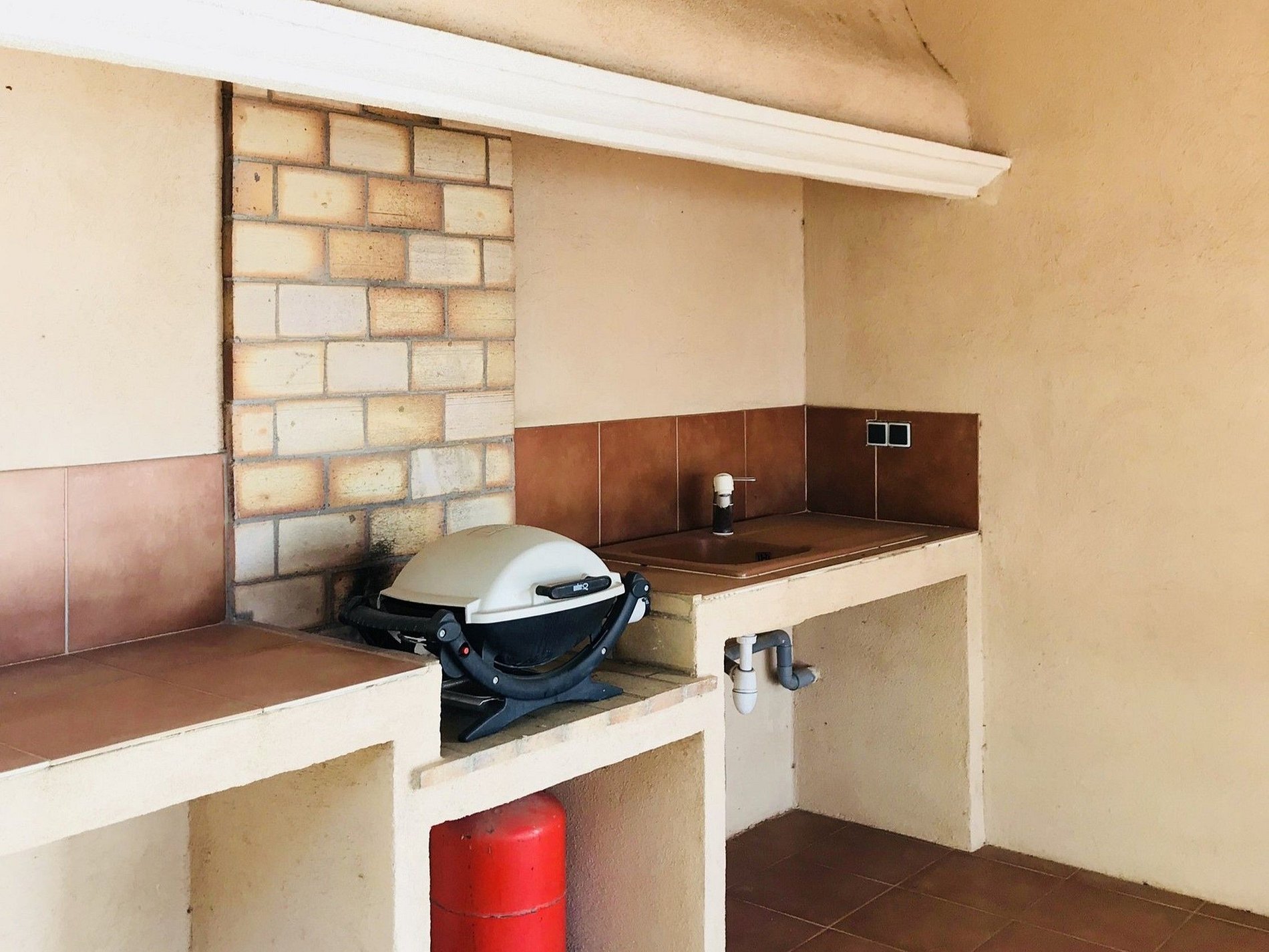 The villa features three beautiful air-conditioned bedrooms, each with a double bed and direct access to the garden, creating a seamless indoor-outdoor living experience. The master suite includes a bathroom with a bathtub, offering a comfortable and private retreat.