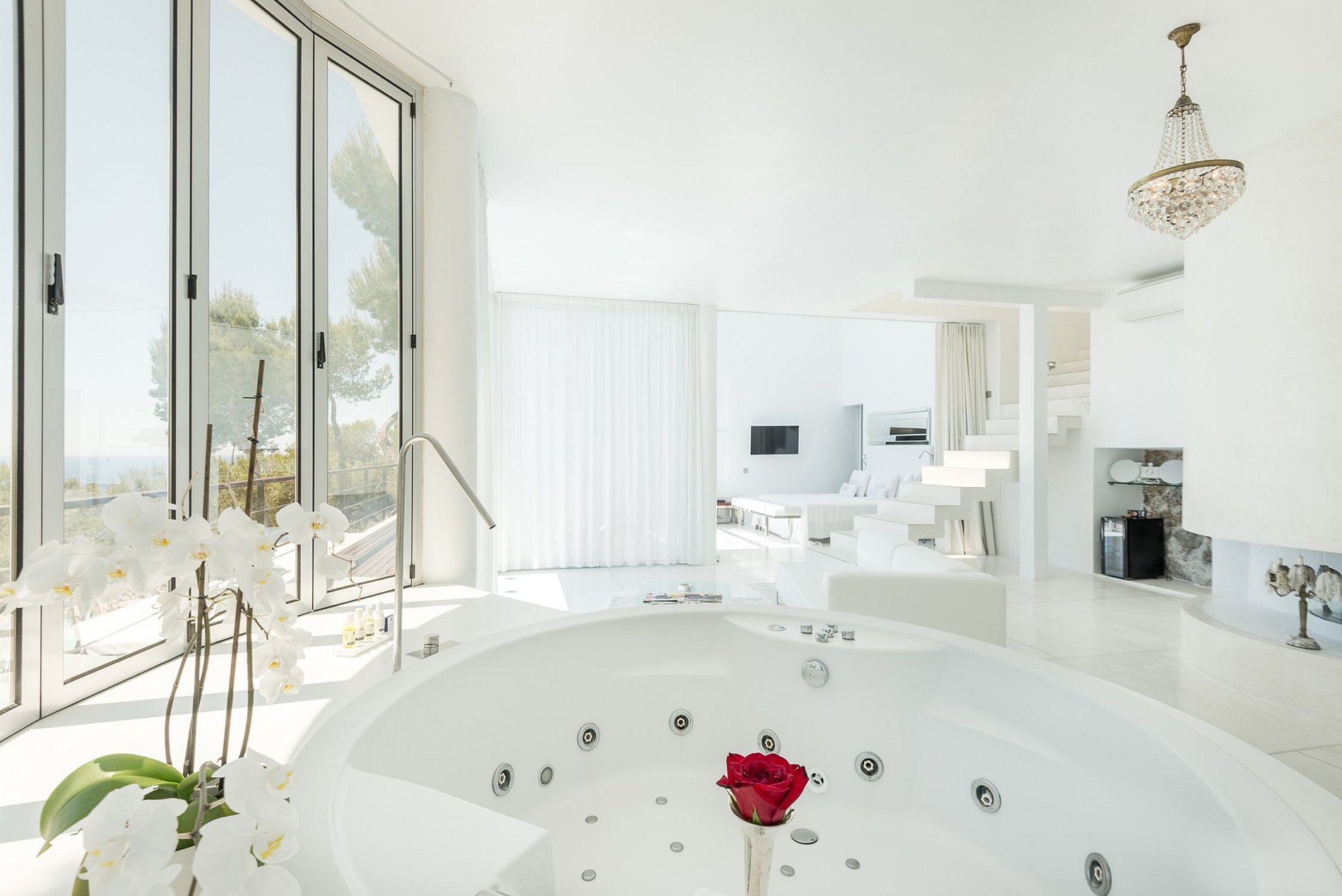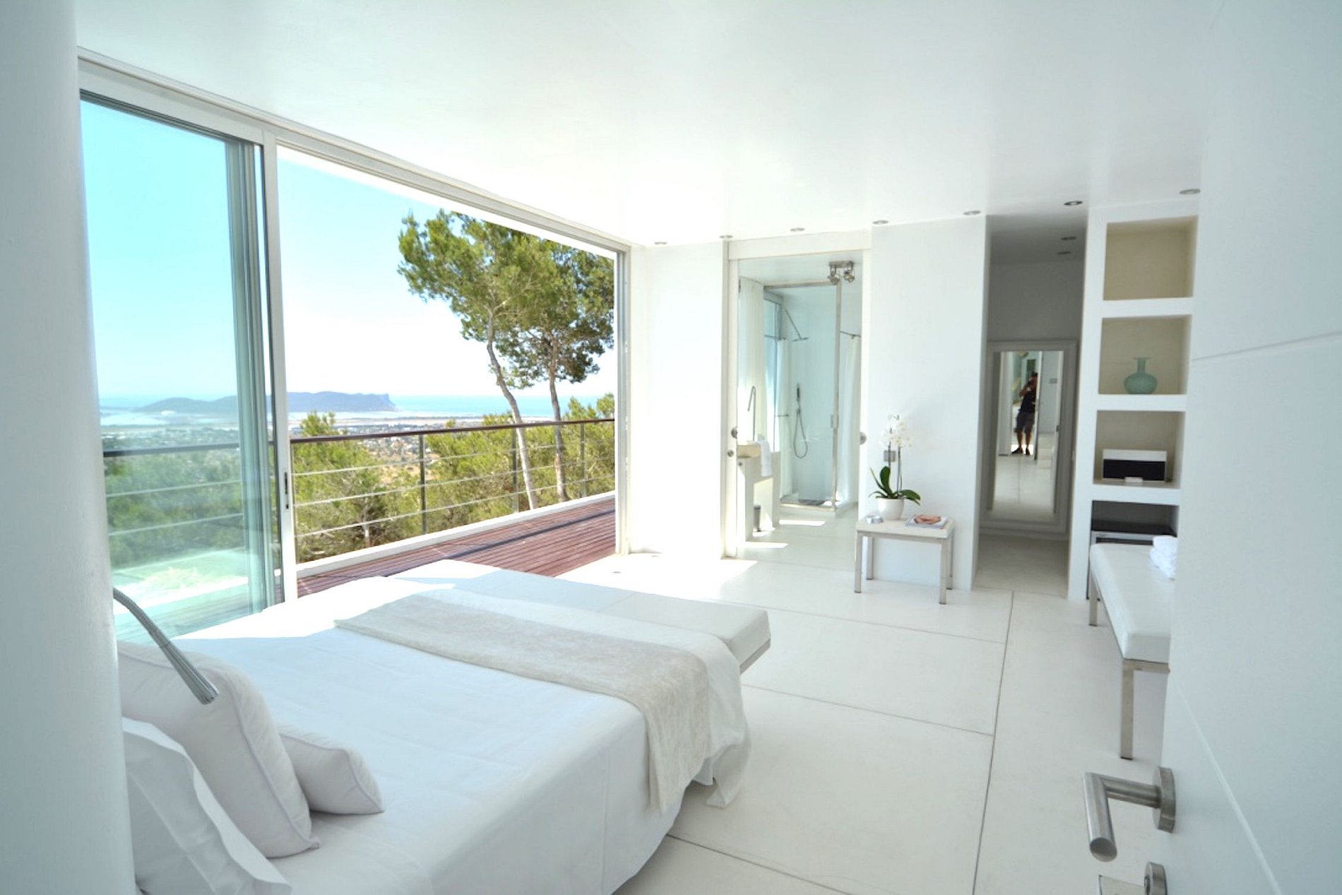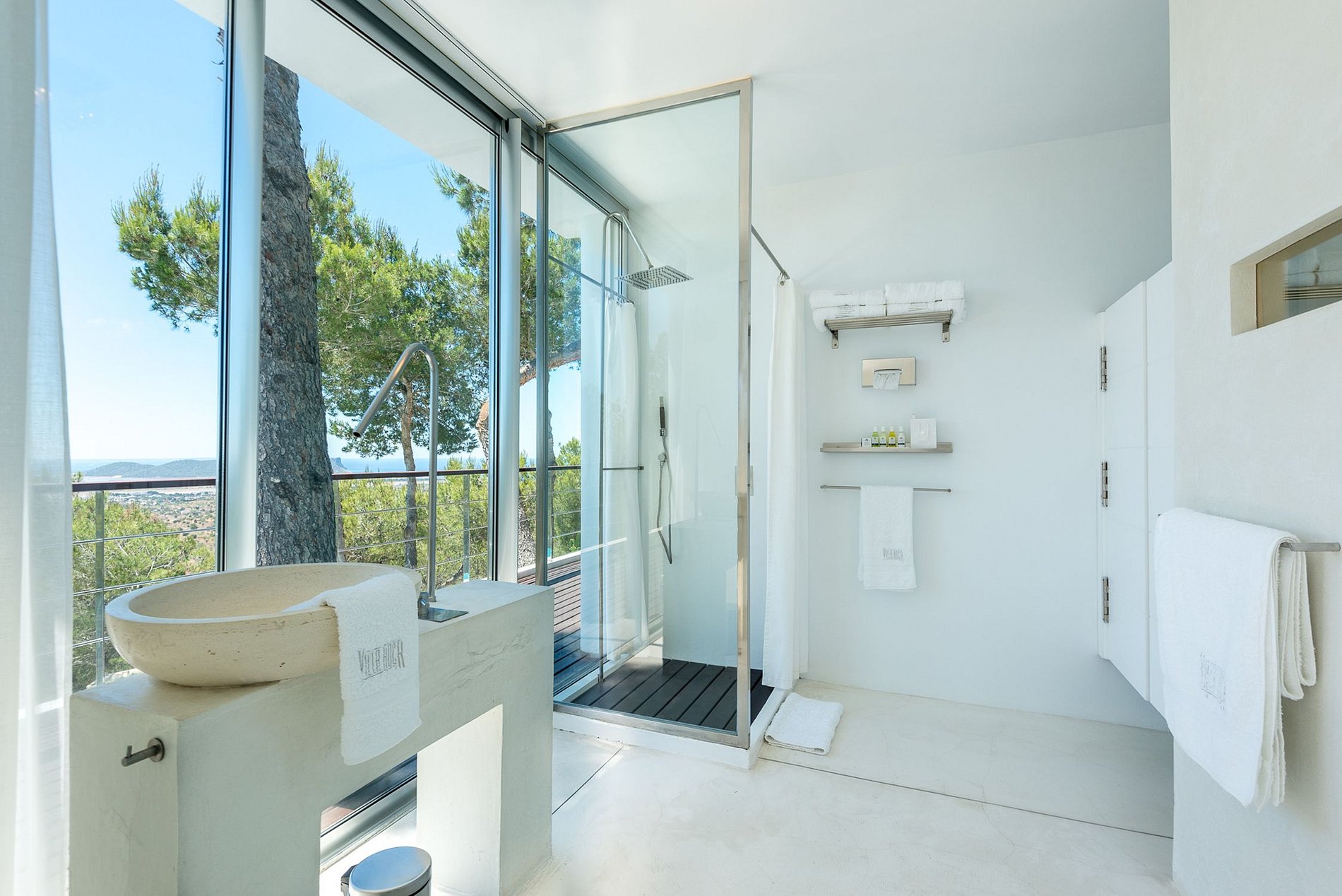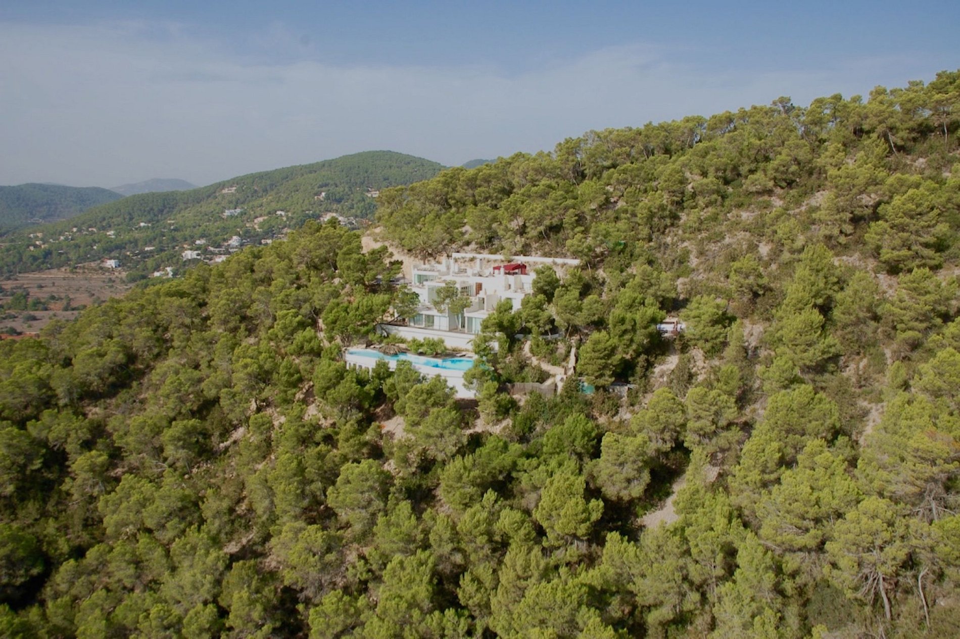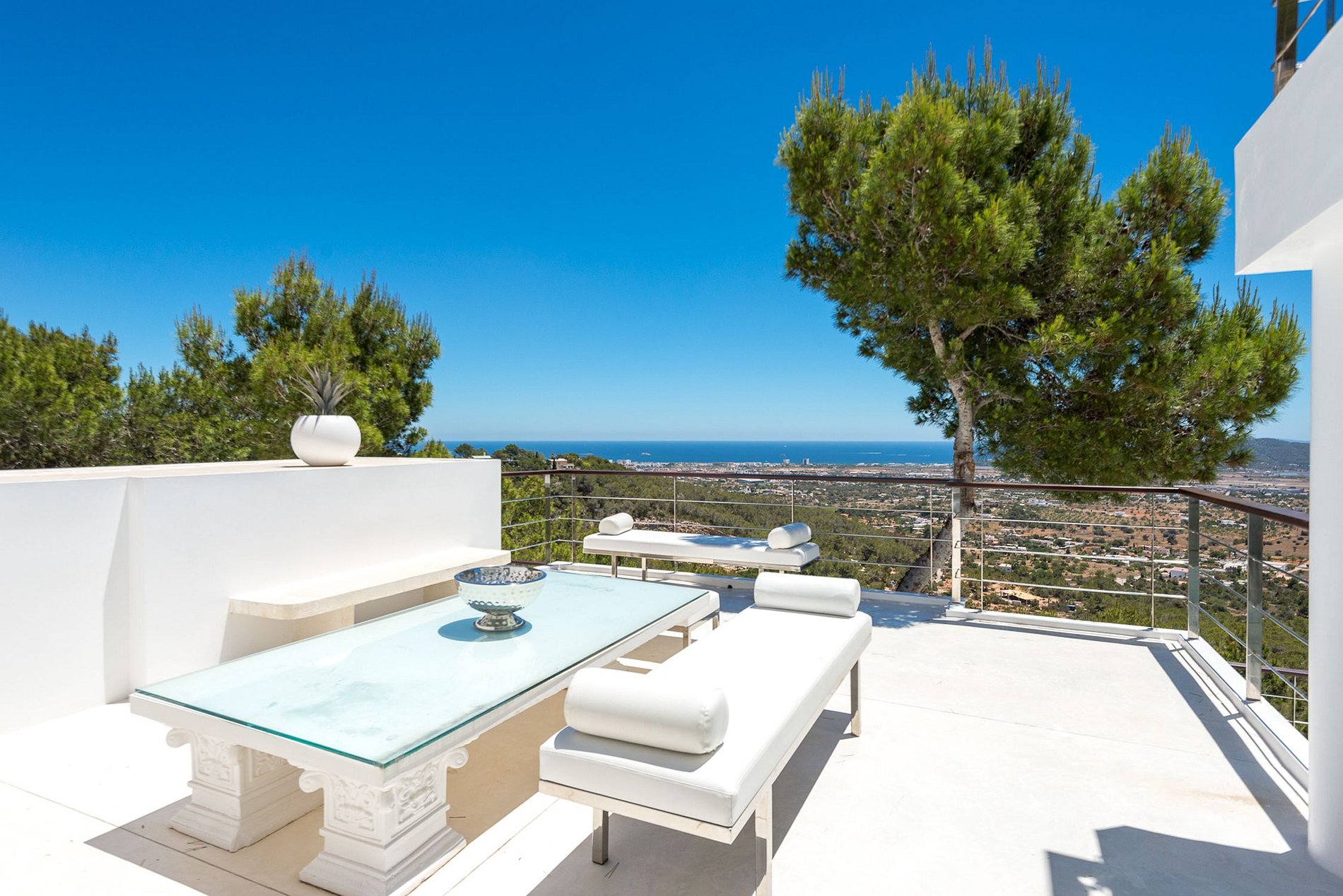 Magnificent, one-of-a-kind villa, an architectural gem, a pure white mansion emerging from the solid rock, beautifully furnished in modern minimalist chic Mediterranean designer style, 8 en-suite double bedrooms, all suites with splendid views, a peaceful, relaxing oasis located in a pine forest. Includes full-time discrete staff, butler, housekeepers, personal chef. The perfect venue for entertaining and hosting unforgettable dinners, parties, and events.