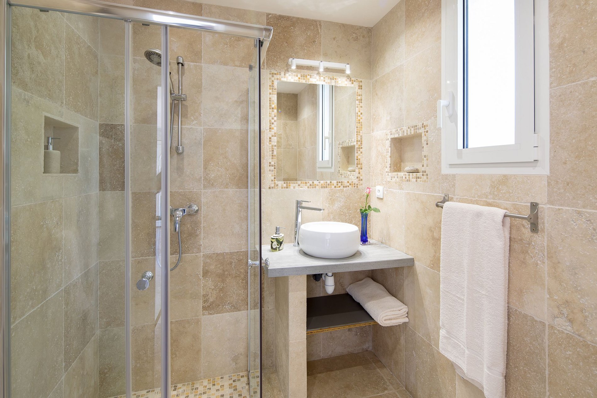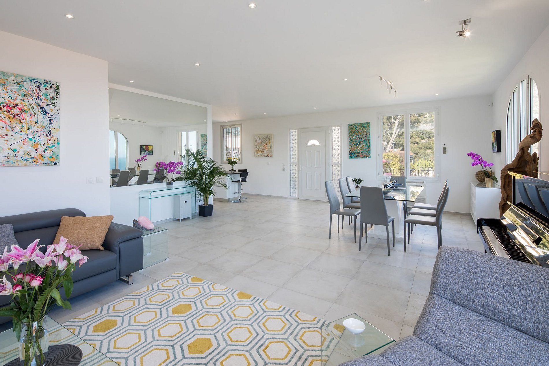 This modern-style property is beautifully furnished and well equipped and can accommodate up to 8 people in 4 en suite rooms (an additional baby bed can be provided upon request). The spacious and cozy living room with fireplace, piano, comfortable sofa, and spacious dining area at the other end of the room, opens onto the garden and two large terraces that are perfect for romantic dining with the sea, garden, and mountain views. The indoor, fully equipped kitchen opens into the living room and dining room. All bedrooms represent spectacular views of the garden or the pool with panoramic views of the Mediterranean sea and floor-to-ceiling windows that bring in spectacular light.