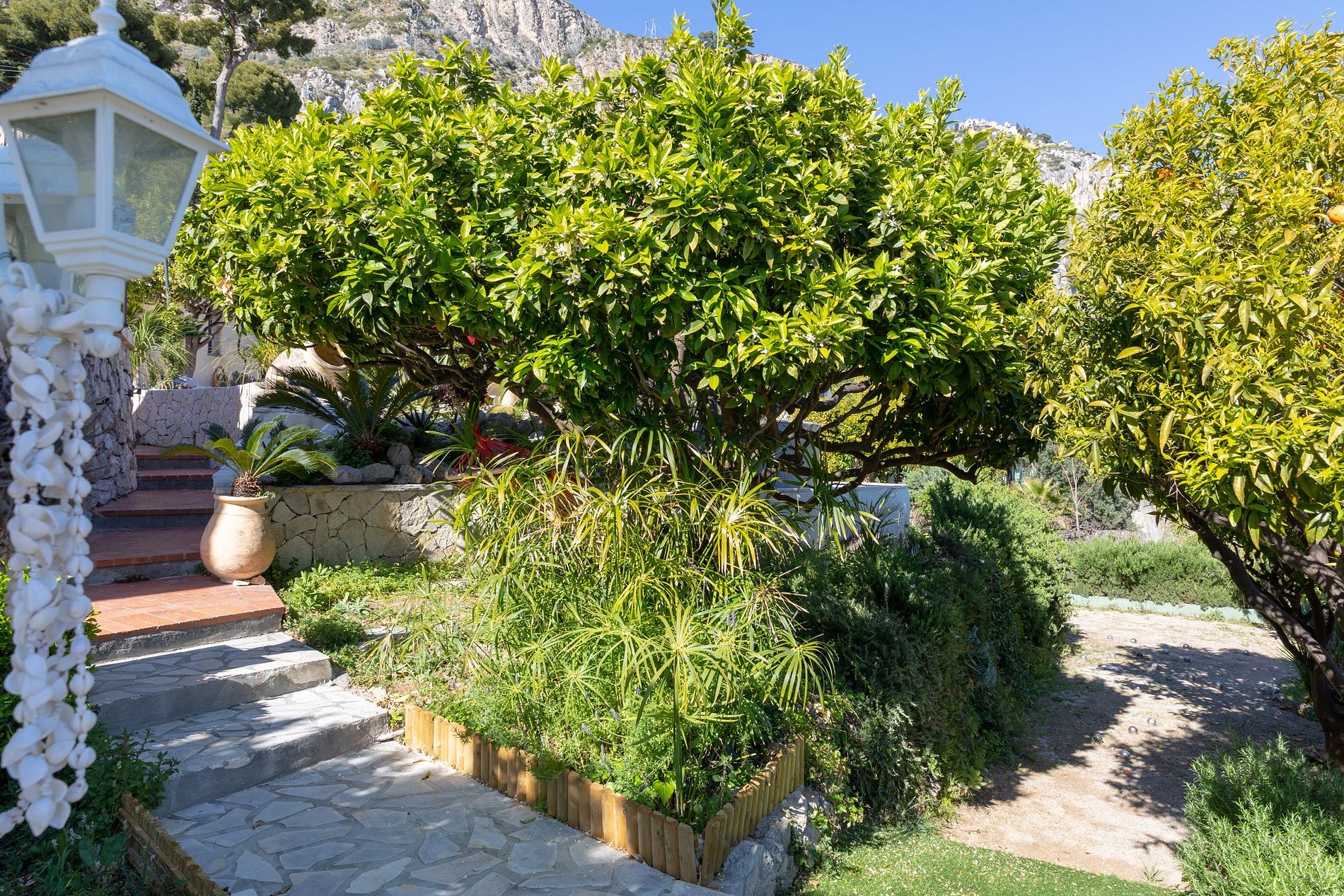 With only a five-minute walk to the beach, the south-facing terraces overlook the Mediterranean garden with a panoramic view of the sea, coastal cliffs, and the mountains. Over 1,100 m2 surrounded by tropical vegetation and fragrant orange and pine trees, this is an ideal, peaceful, and relaxing vacation environment.