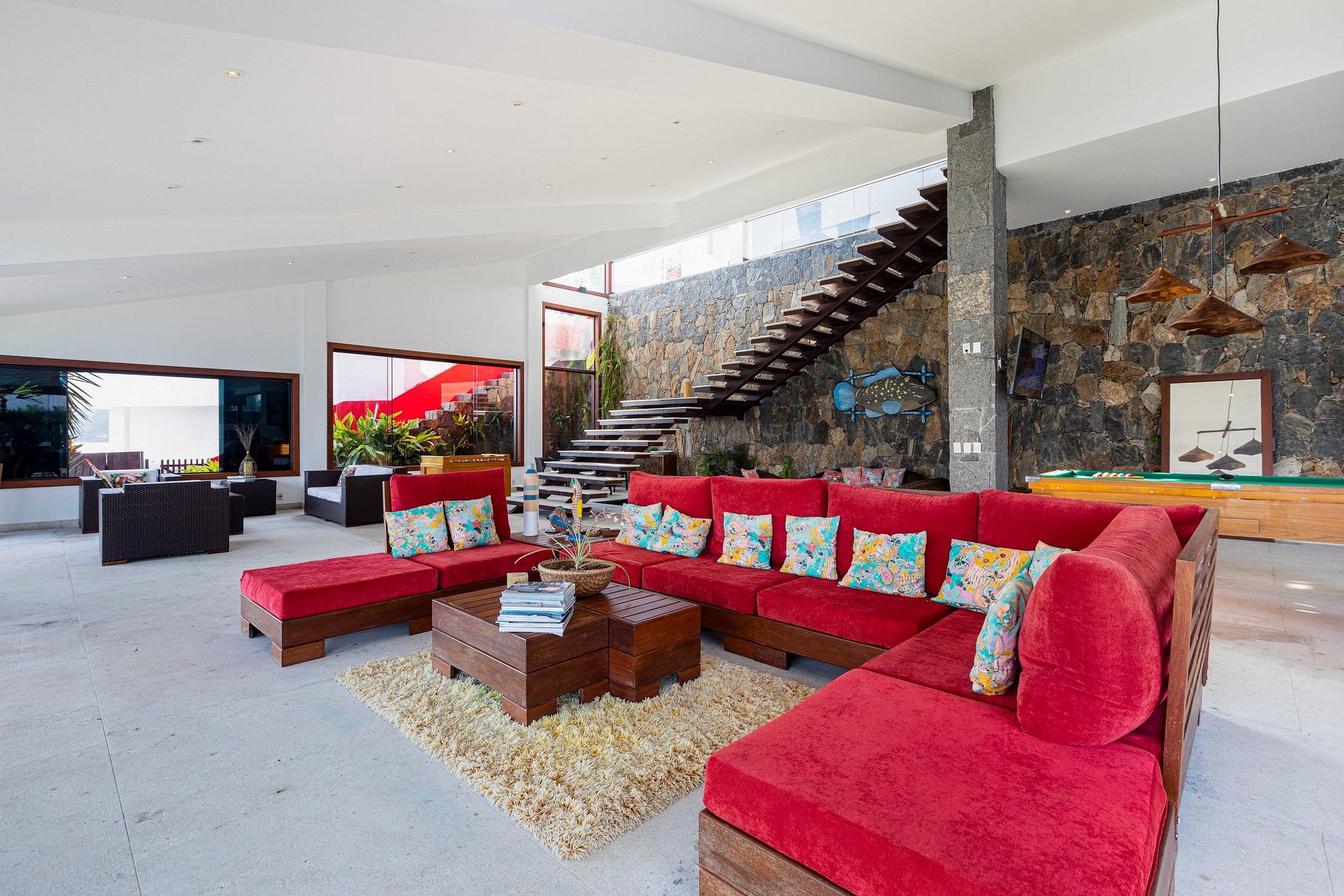 The house features a large living room decorated with planned furniture, a children's space with toys and a TV with children's content, a dining area with a table for 12 and a lovely artificial lake that contrasts with the beauty of the environment. The entire living area is glazed giving access to the outside area and an incredible view of the ocean and the sunlight that illuminates the entire area.