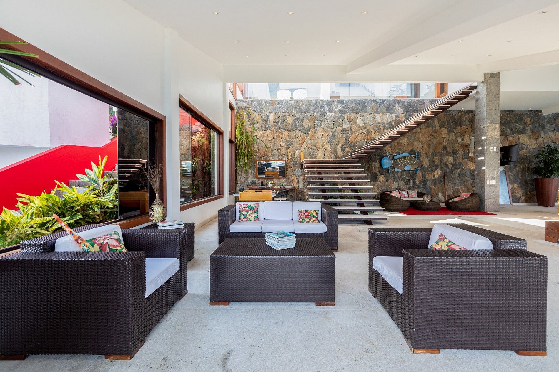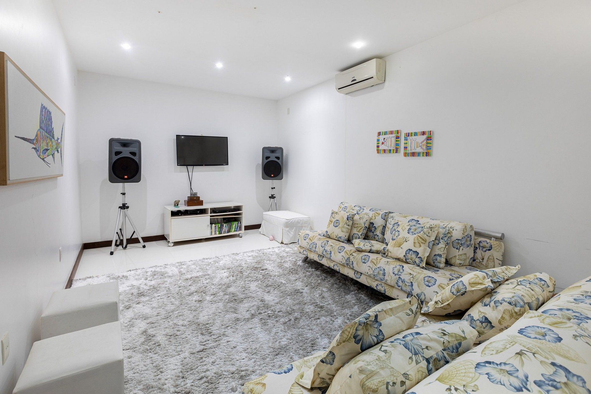 The house features a large living room decorated with planned furniture, a children's space with toys and a TV with children's content, a dining area with a table for 12 and a lovely artificial lake that contrasts with the beauty of the environment. The entire living area is glazed giving access to the outside area and an incredible view of the ocean and the sunlight that illuminates the entire area.