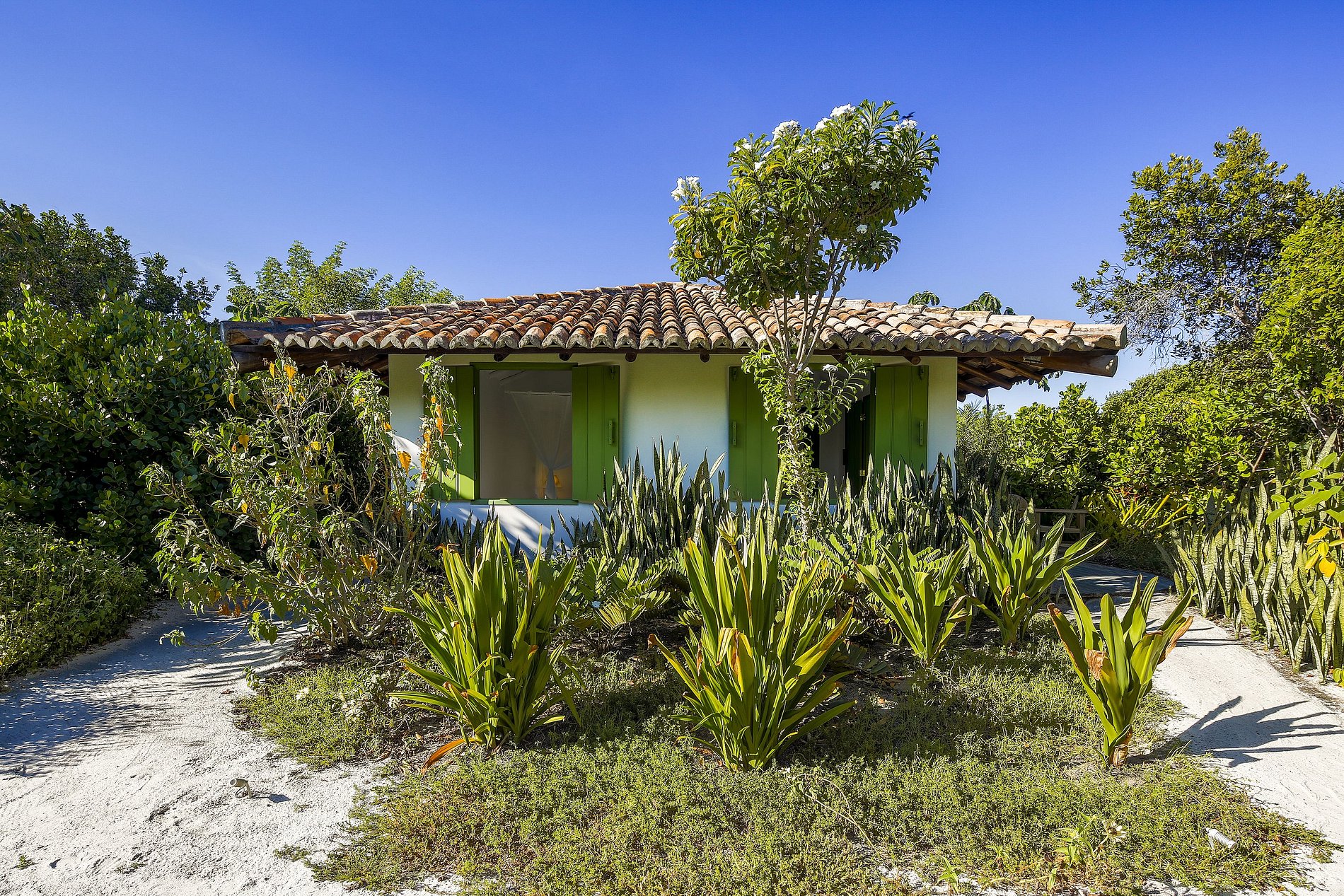 The white sand paths surrounded by vegetation and colourful flowers take you to the large dining room, the gym, the massage and relaxation space or the large deck of the long pool and its pergola with XXL sofa where pleasant and memorable family