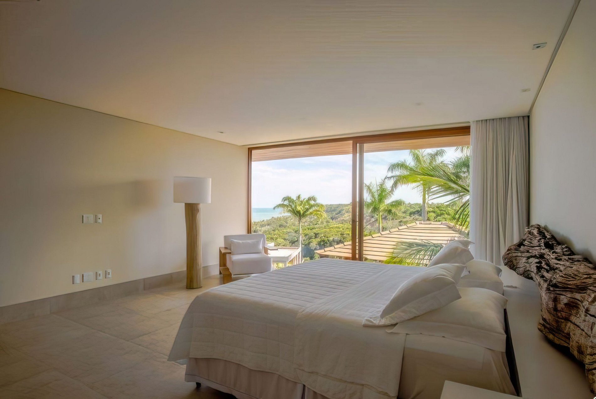 Master suite 1: King-size bed, air conditioning, writing desk, bathroom with double sink, panoramic view of the beach and the sea.