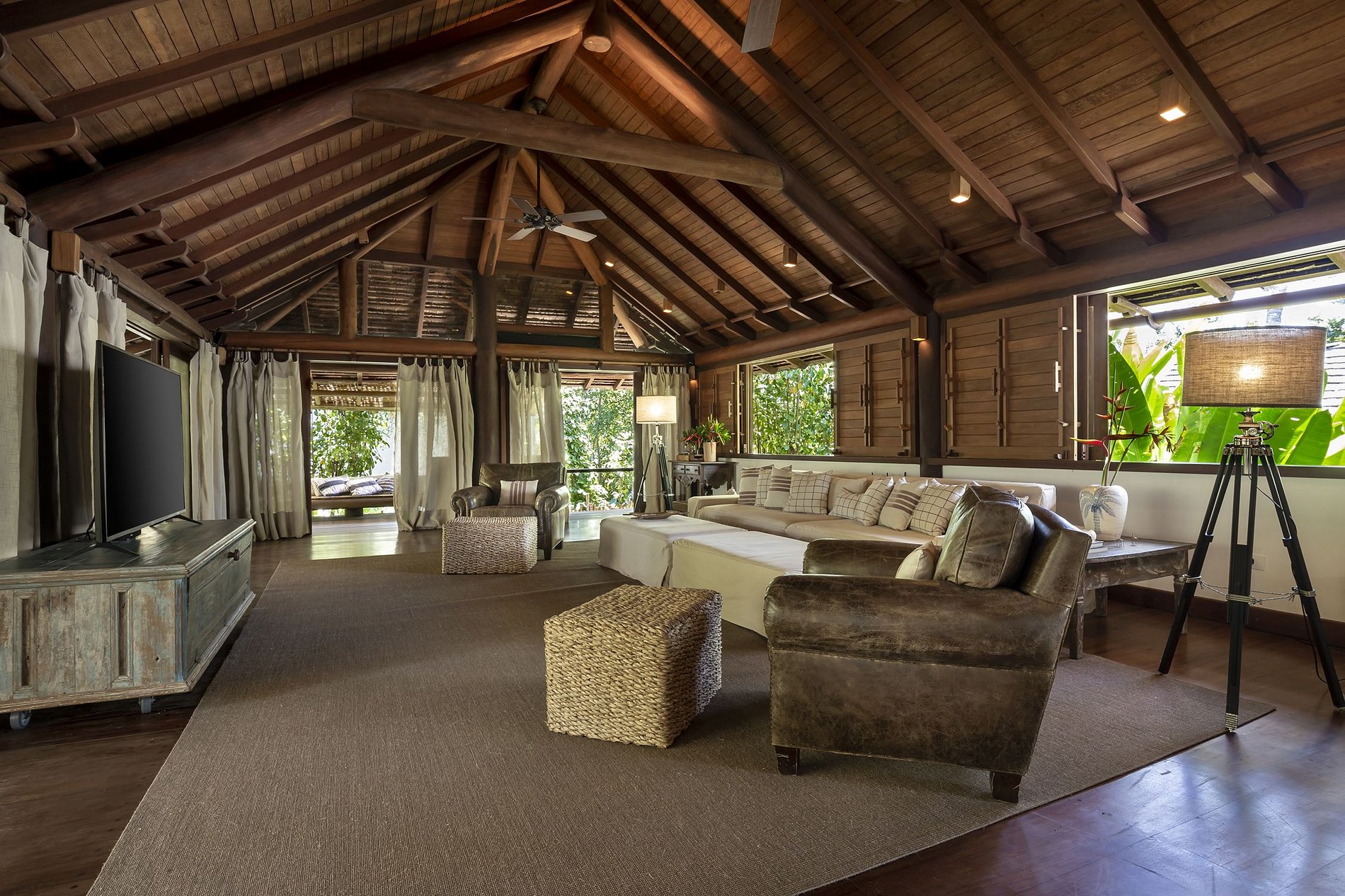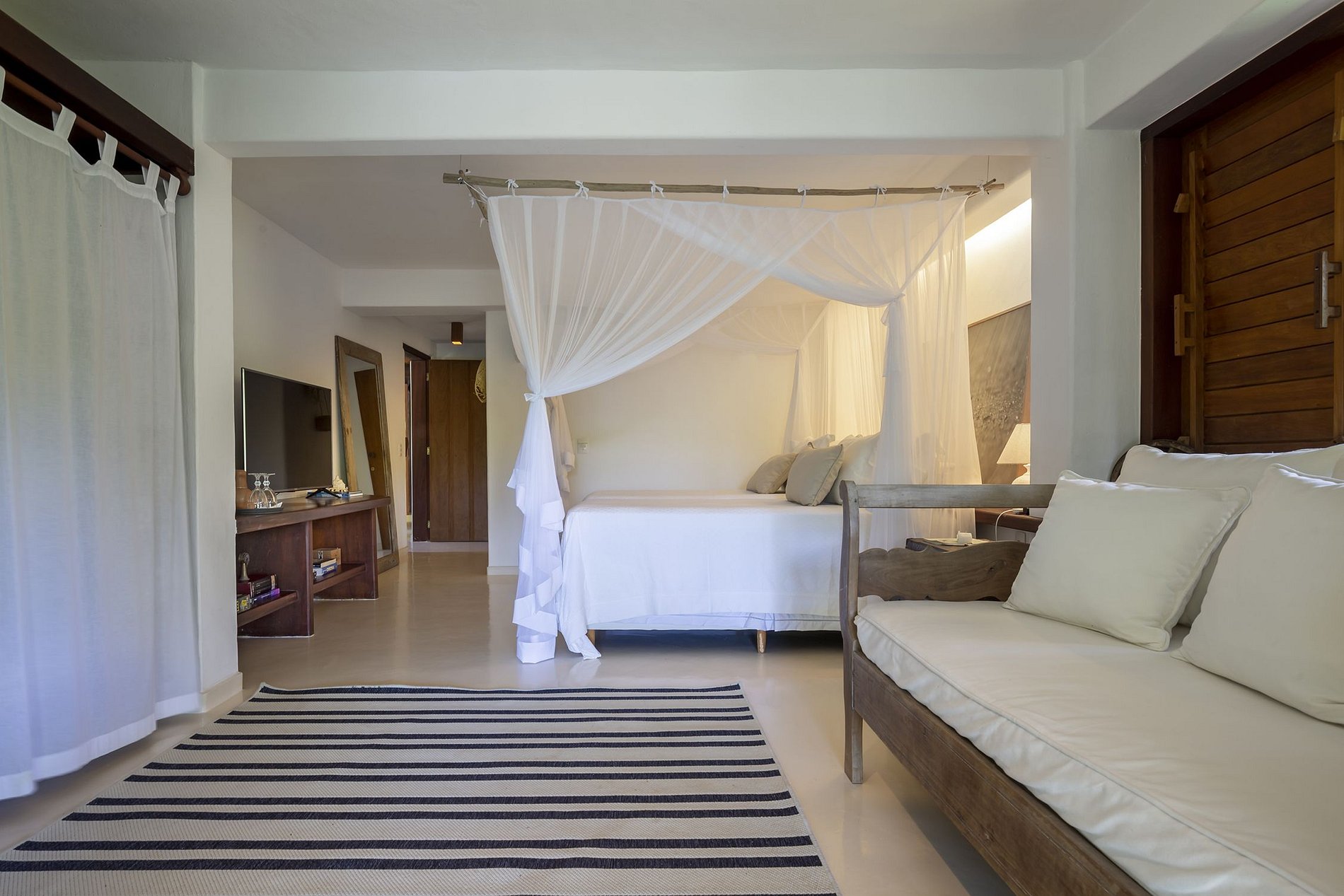 - MASTER SUITE overlooking the lagoon, living room and deck with sea view, large bathroom with bathtub, hairdryer, closet, AC, 60” TV, minibar and king size bed;
