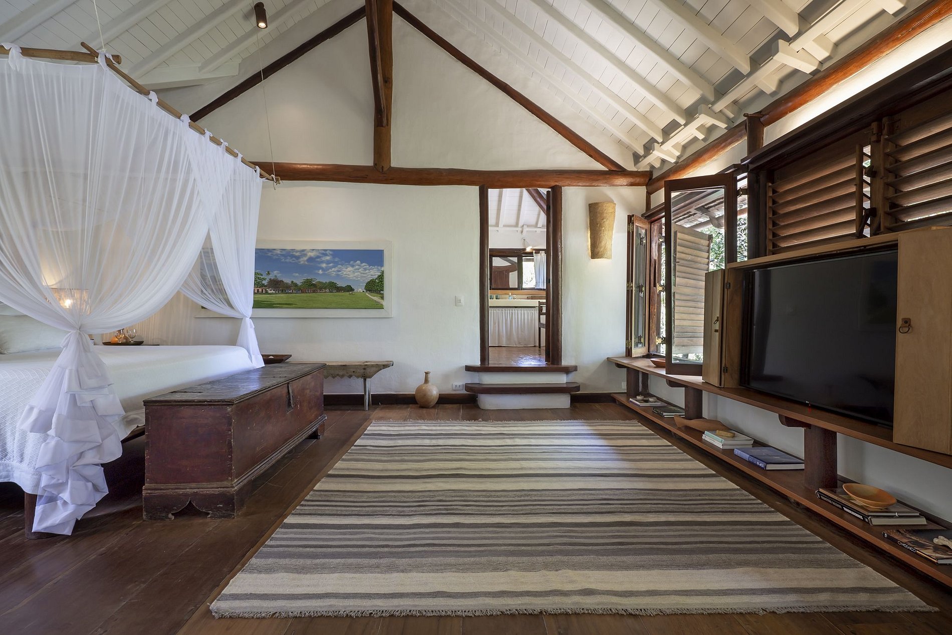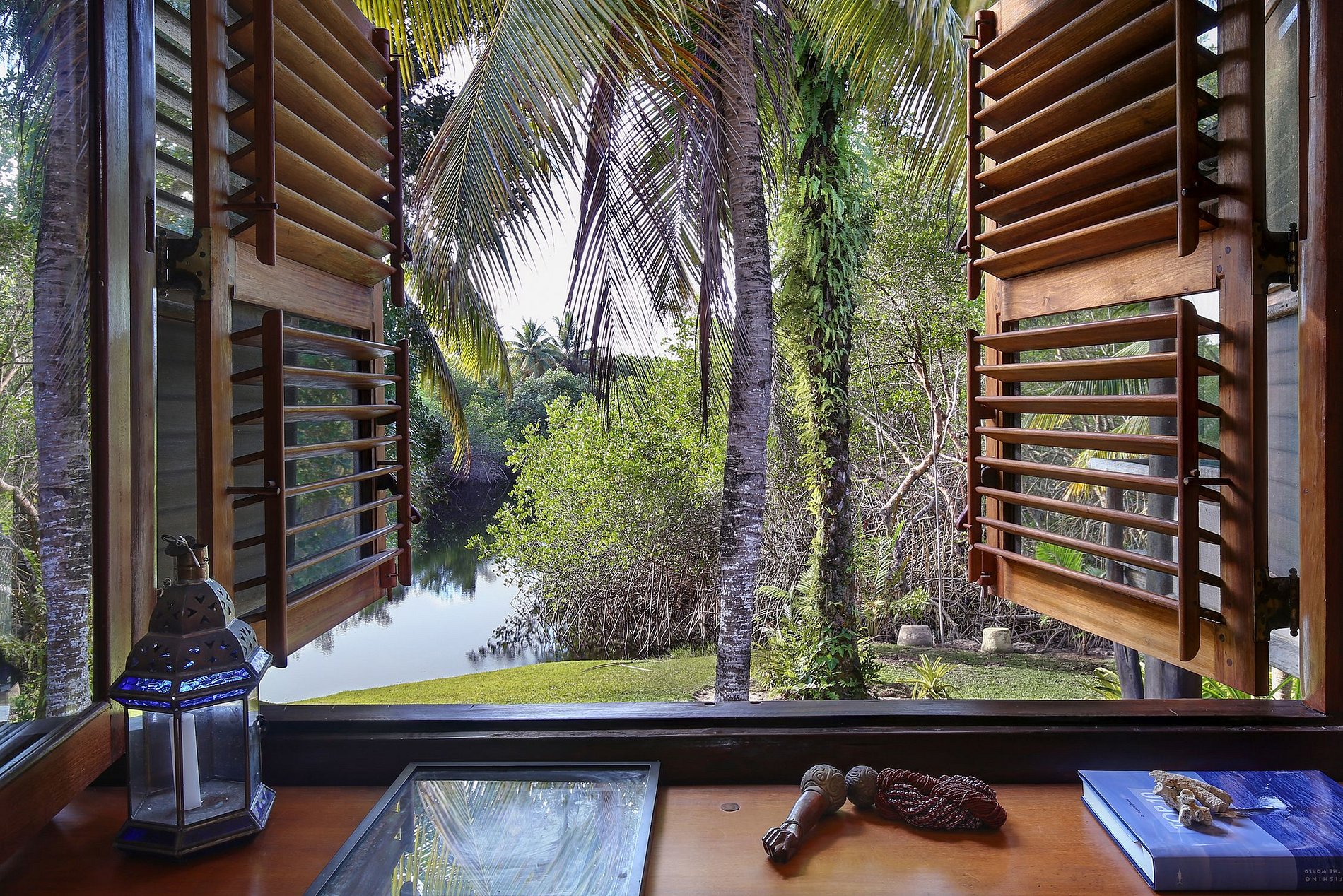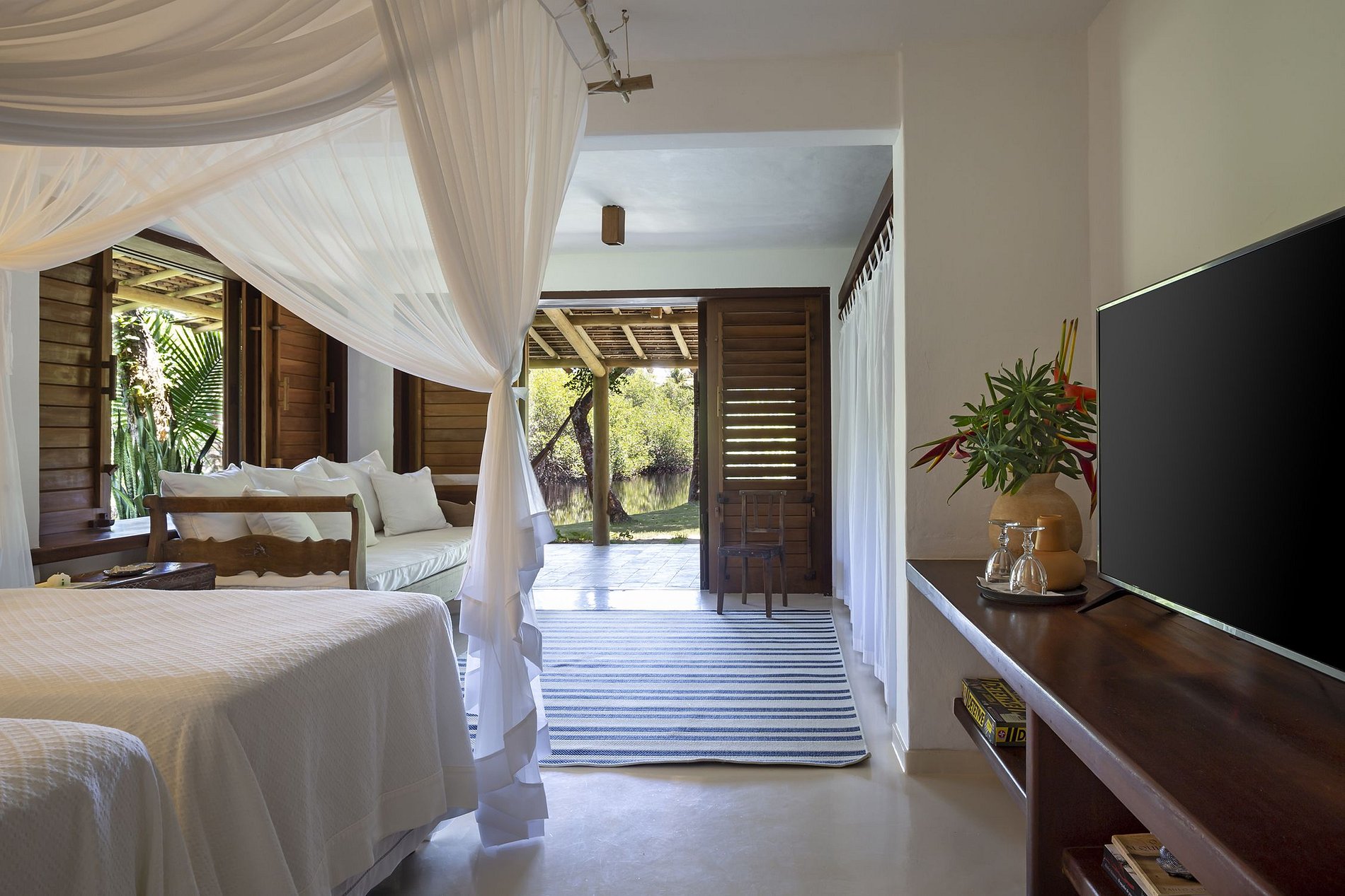 Villa with an exclusive access, crossing a wooden bridge over a lagoon of the river Rio da Barra. Environment of untouched nature, construction in harmony with it, that fill the spaces and senses.