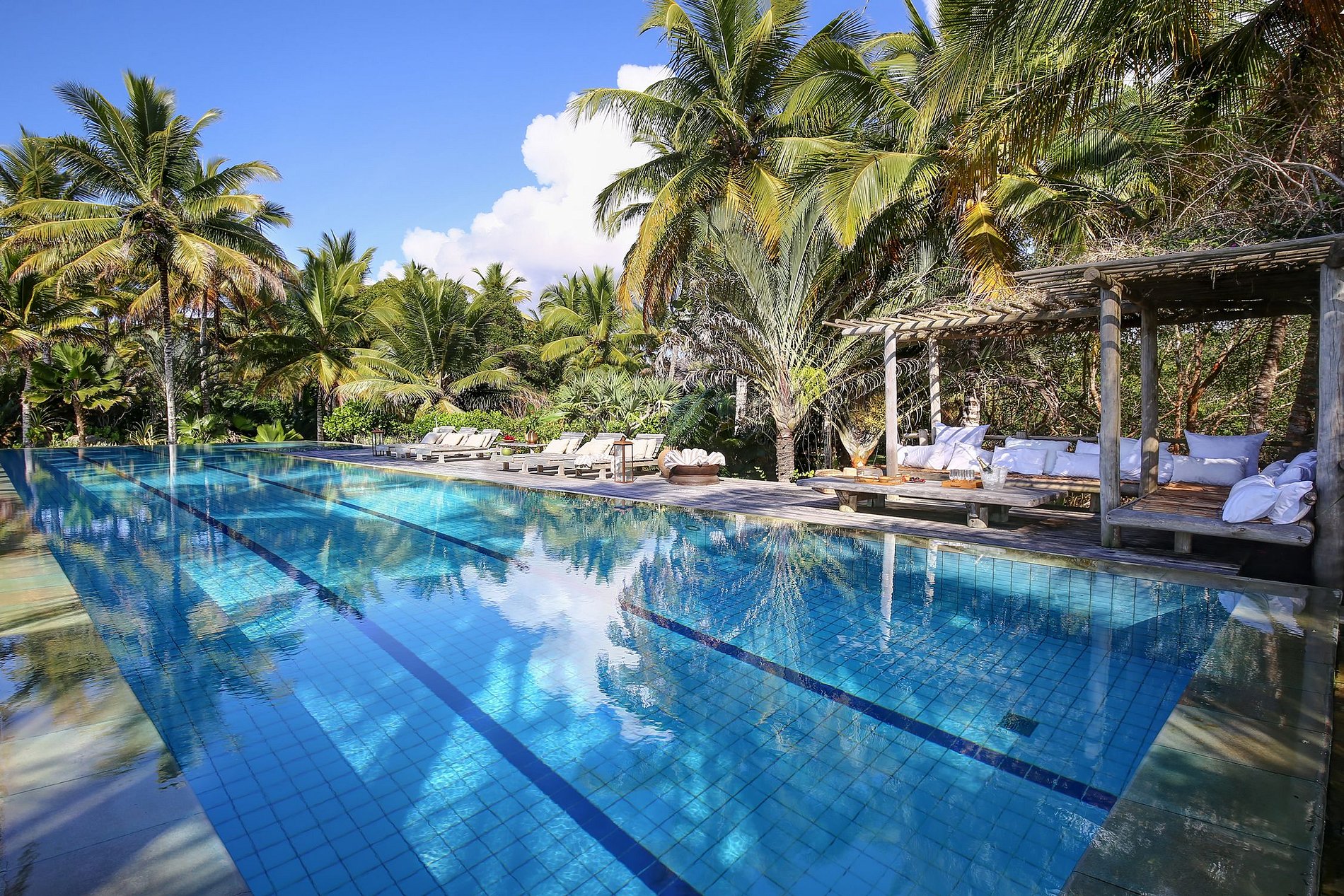 House with pool, living area and suites with sea view.