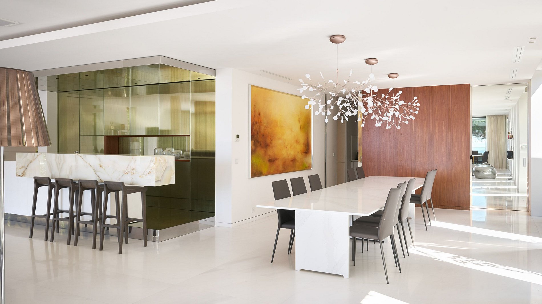 Upon entering, guests are welcomed into a bright and spacious living area, perfect for entertaining, complemented by a sophisticated dining room and an open-concept kitchen with a bar, ideal for casual gatherings.