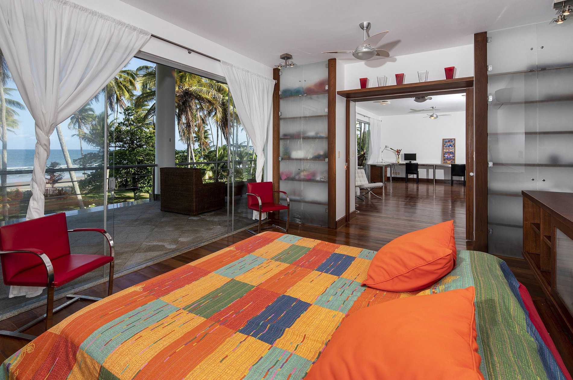 The upper floor where the TV room is located, has 4 suites including the Master suite with sea view, accompanied by its large office, has a large balcony / terrace, present all around the house.Its ones of the many relaxing places of this house, ideal to relax in harmony with the sea, the nature and the beautiful garden, enjoying the refreshing sea breeze, in a hammock or comfortable sun loungers.