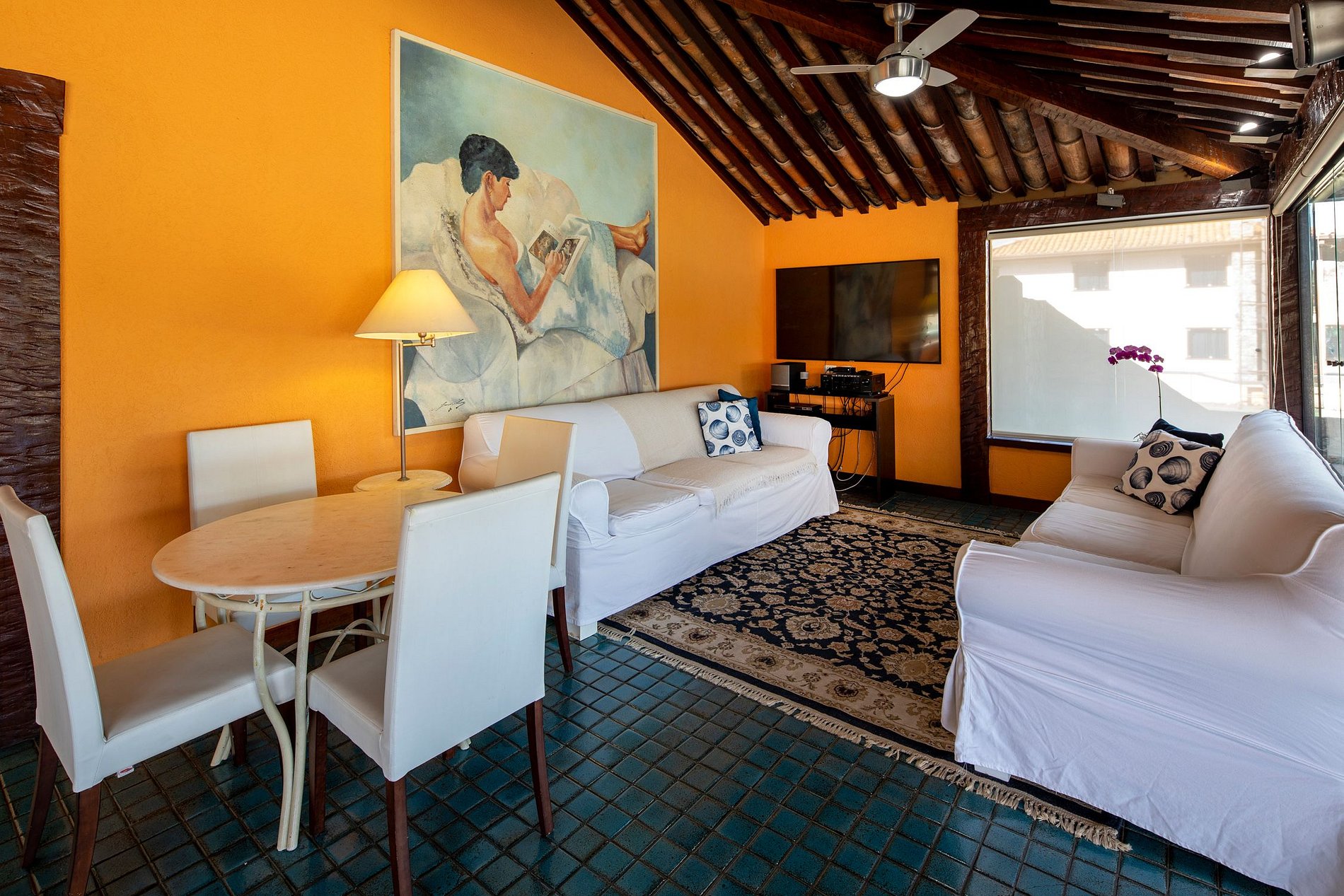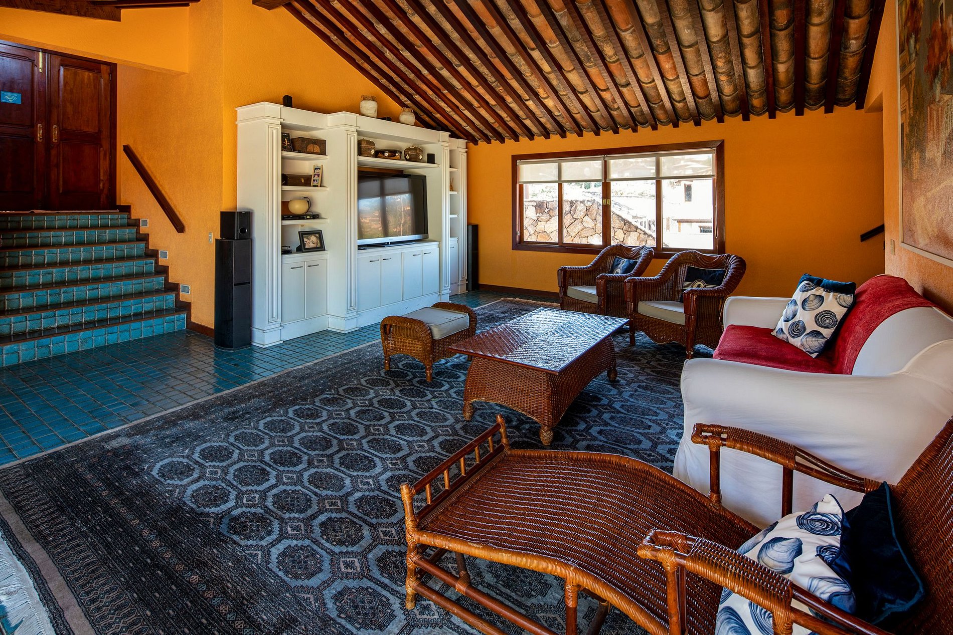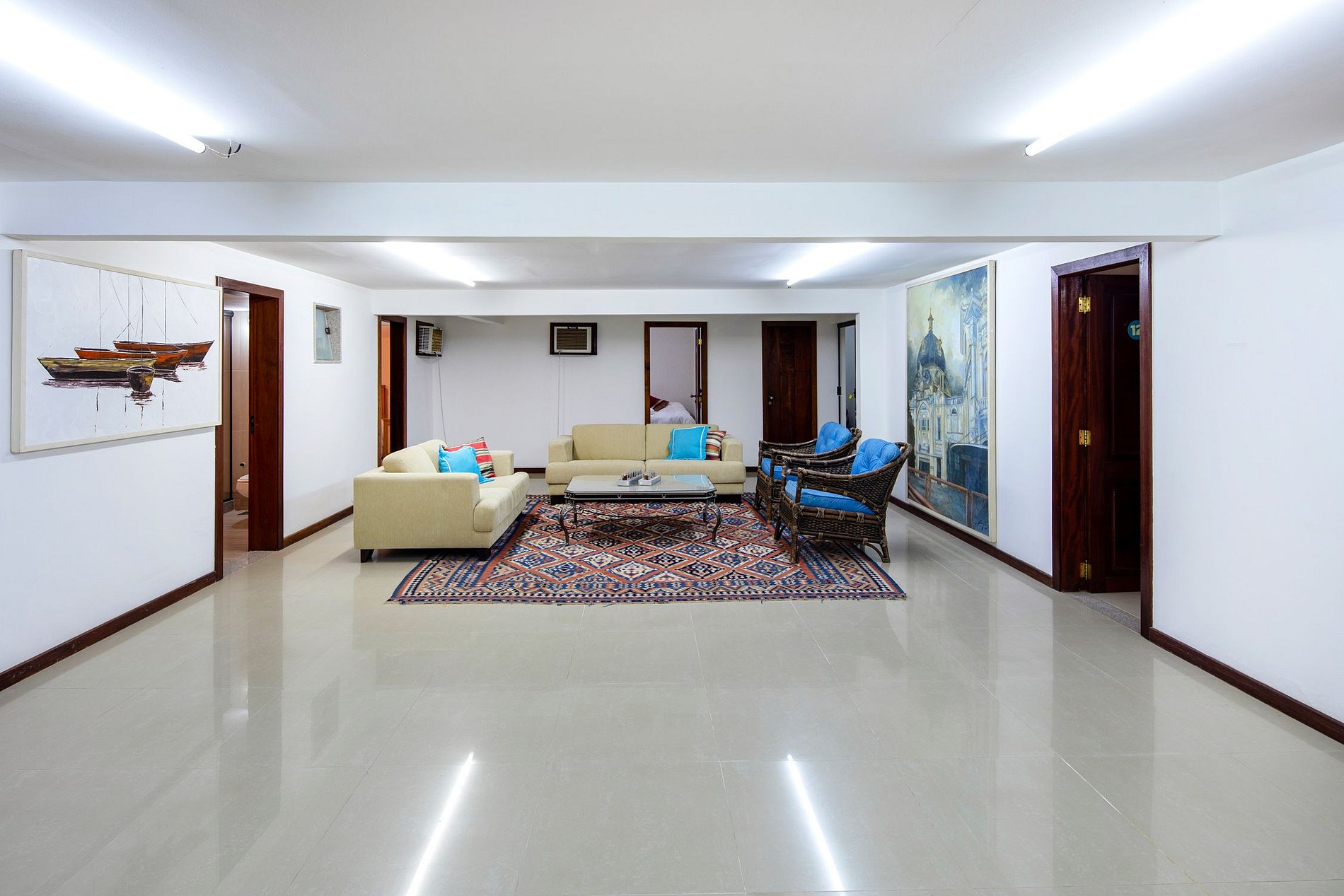 A large living room with beautiful furniture and designed sofas that provides total comfort while resting and working on your laptop as well as an excellent sound and video system to watch TV with family and friends.
