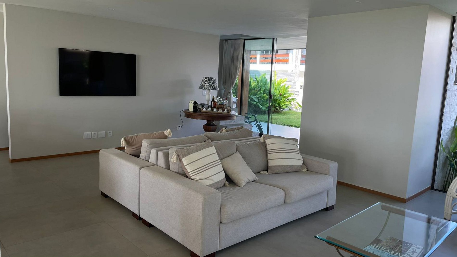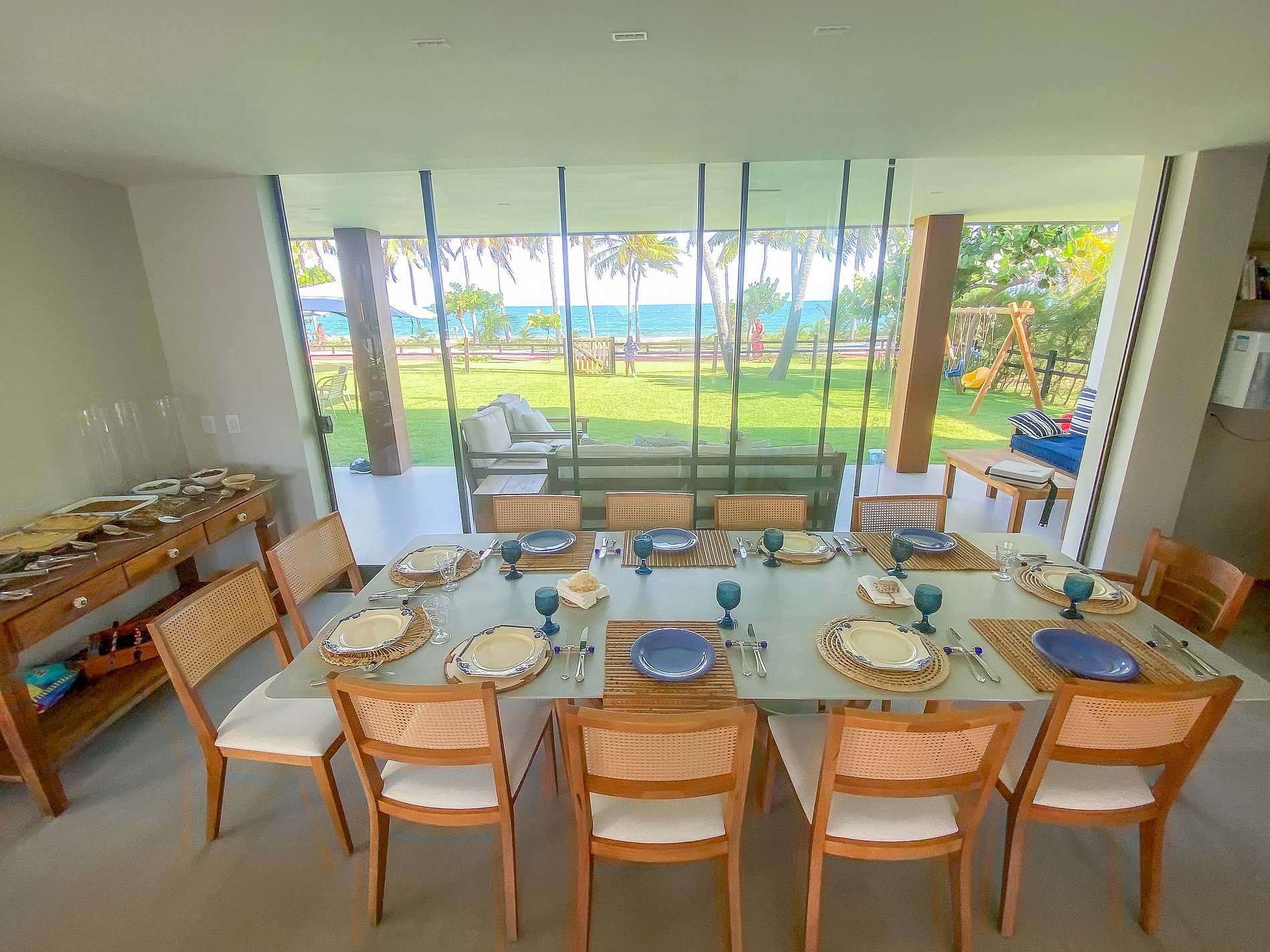 The house is spectacular. Huge. The house is very well furnished and equipped. The dining room has a table for 10 people. The living room has comfortable armchairs and sofas that integrate the TV room. From the balcony to the beautiful swimming pool. And the gourmet kitchen equipped with barbecue and beer maker. A beautiful lawn with sea views. Still on the first floor is the laundry room, bedroom and bathroom for service. The internal kitchen is equipped with two refrigerators, a stove and an electric oven. Equipped and complete kitchen. Between the kitchen and the living room there is a pantry with a table for 4 seats.