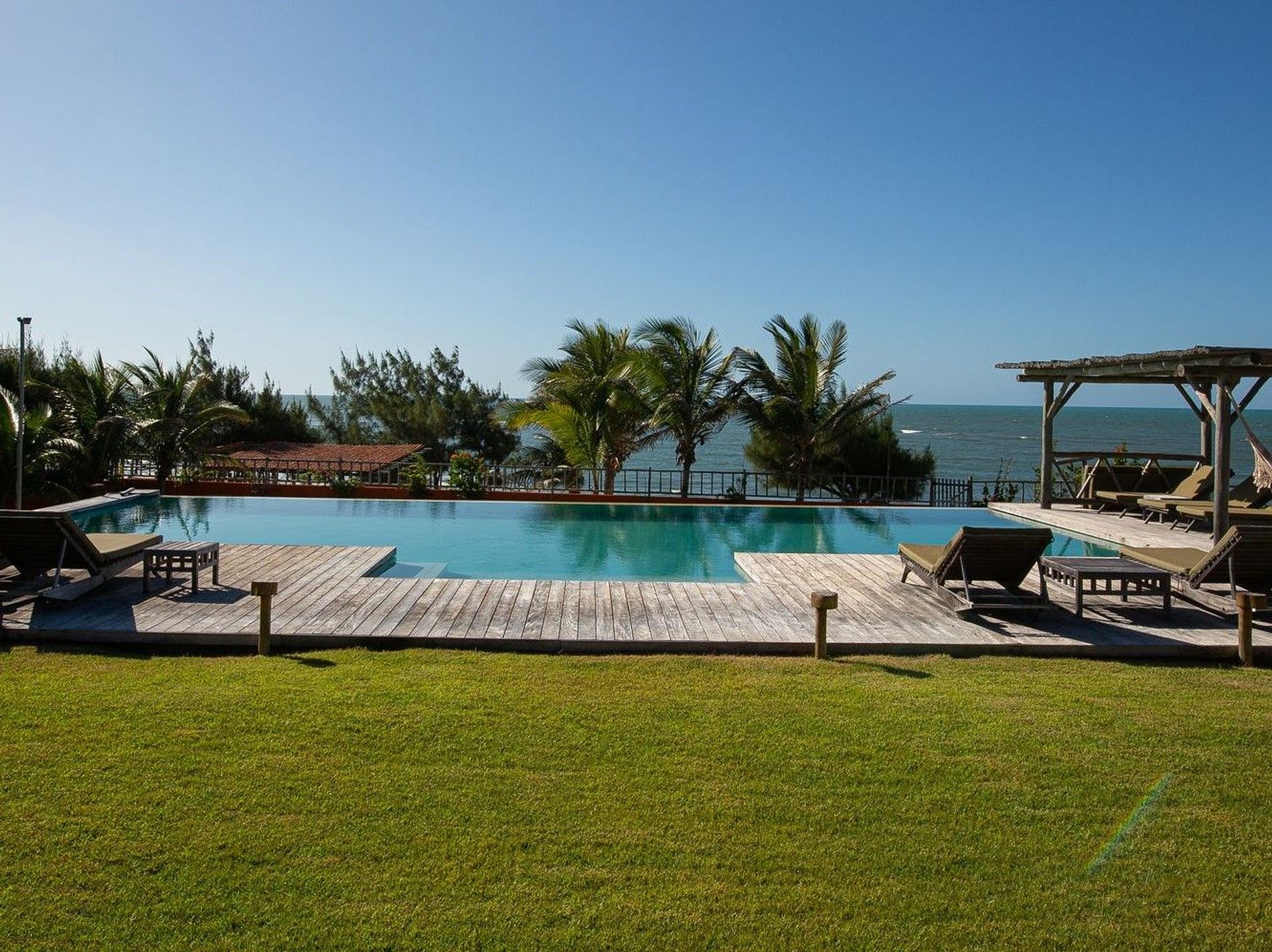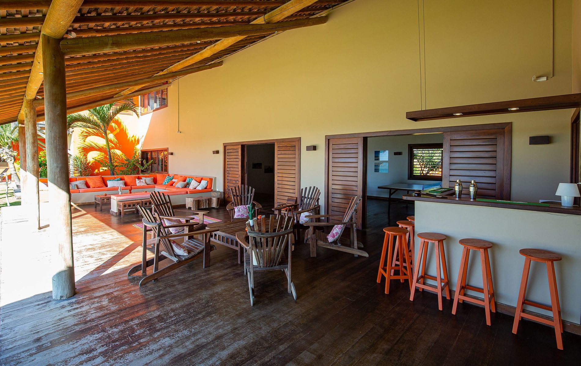 The house has 600m² of built area, starting with the beautiful living room furnished with all wooden furniture and decorated with local crafts. The room has access to the living room outside the house that has several hammocks for rest and a beautiful garden with a large swimming pool with comfortable sun loungers.