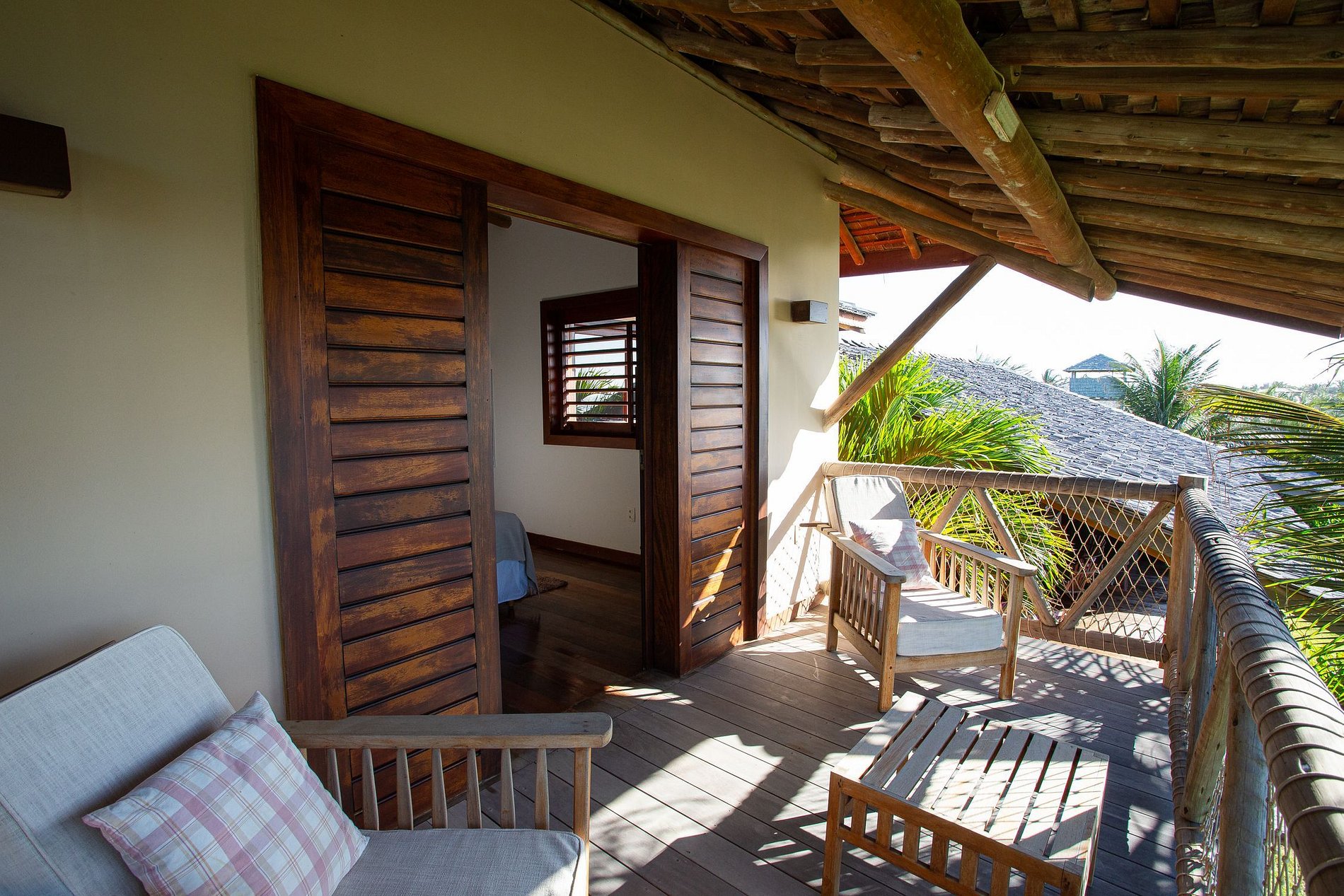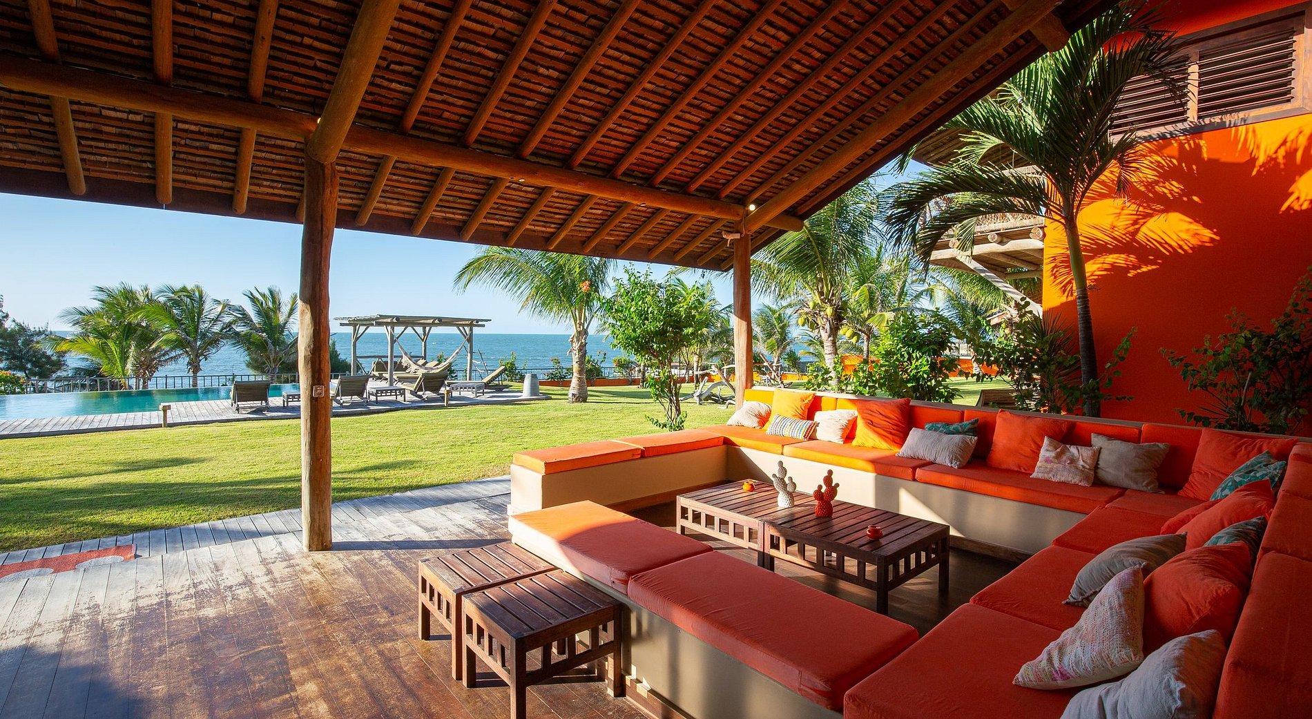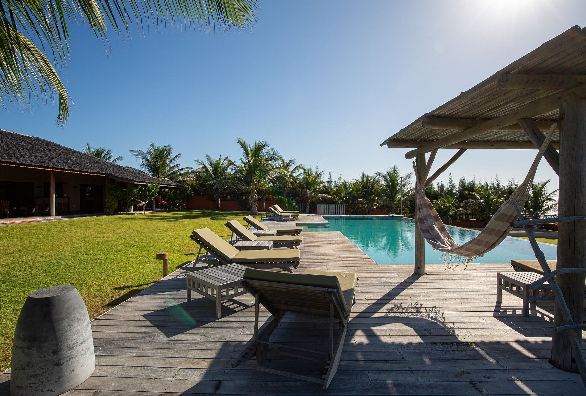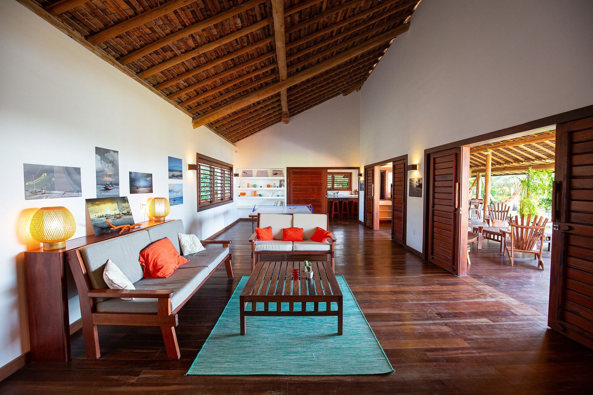 The house has 600m² of built area, starting with the beautiful living room furnished with all wooden furniture and decorated with local crafts. The room has access to the living room outside the house that has several hammocks for rest and a beautiful garden with a large swimming pool with comfortable sun loungers.