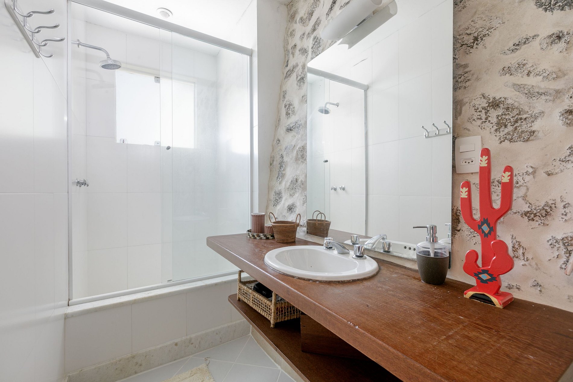 On the second floor, the open concept kitchen offers a modern and elegant environment with quality utensils, ideal for those who love to cook and socialize. The large living room, decorated with stone and wood, is perfect for relaxing moments, with enough space for the whole family.