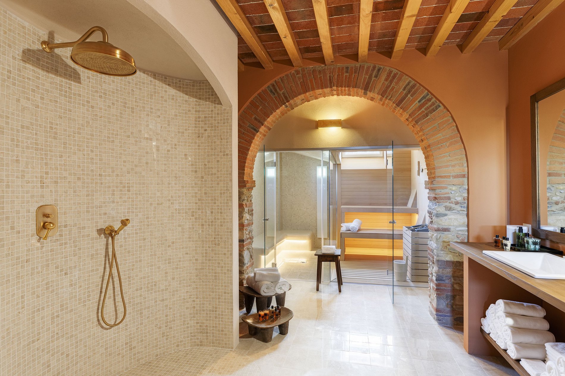 Inside the villa, traditional features blend with modern conveniences, such as an elevator, lounges on all three floors, and a spa area that includes a heated swimming pool, sauna, hammam, and treatment room.