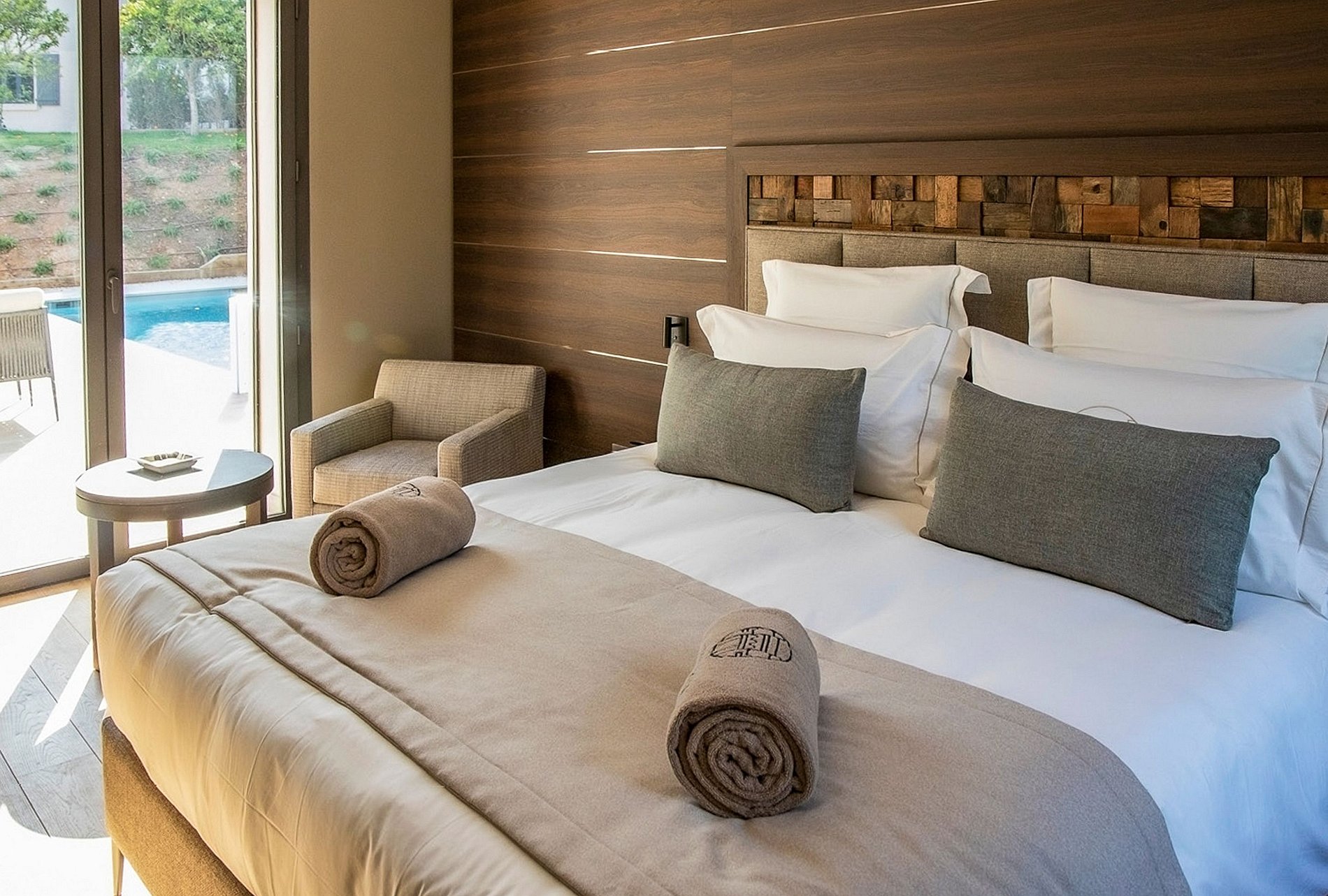 This Villa features 320m2 of indoor space, two residences with a rosemary-lined heated swimming pool and a park with alleys of palms and olive trees offering a quiet and perfect stay, with complete discretion.