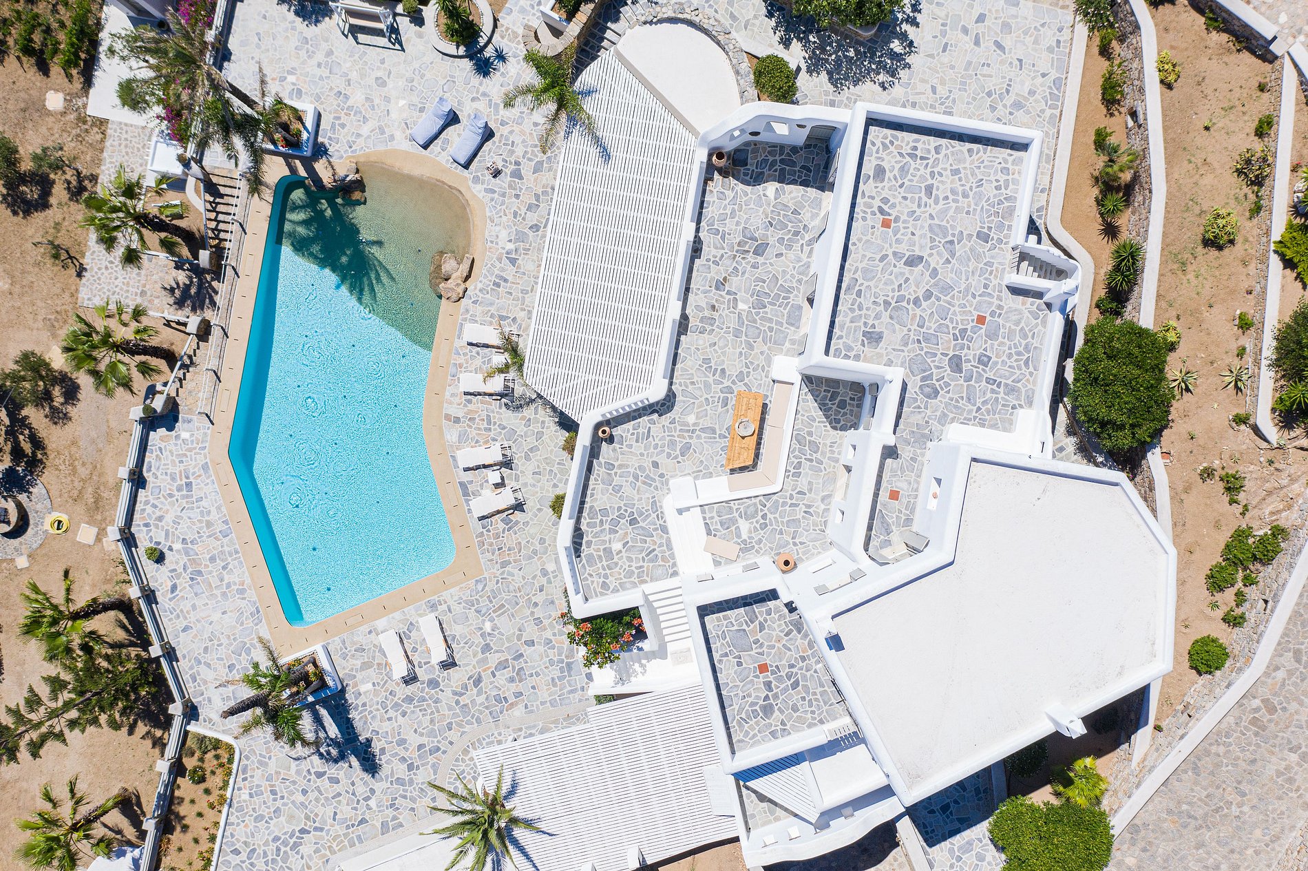 Despite being situated in the bustling island of Mykonos, it provides a tranquil haven that is ideal for families and anyone seeking a peaceful holiday. The villa's expansive outdoor area and magnificent views of the Aegean Sea, coupled with its secluded, beach-like pool, offer an unforgettable lifestyle experience to guests. Additionally, the villa is well-suited for hosting various types of events, including weddings and parties, as it is easily accessible via a paved road.