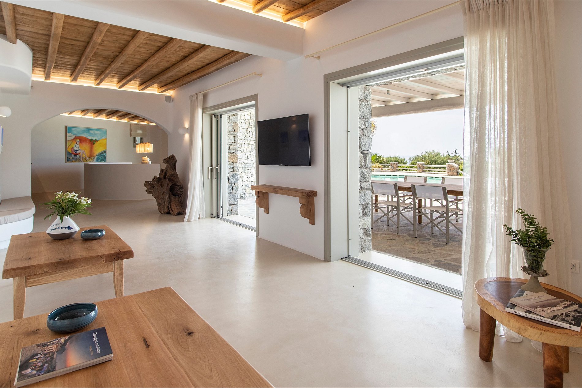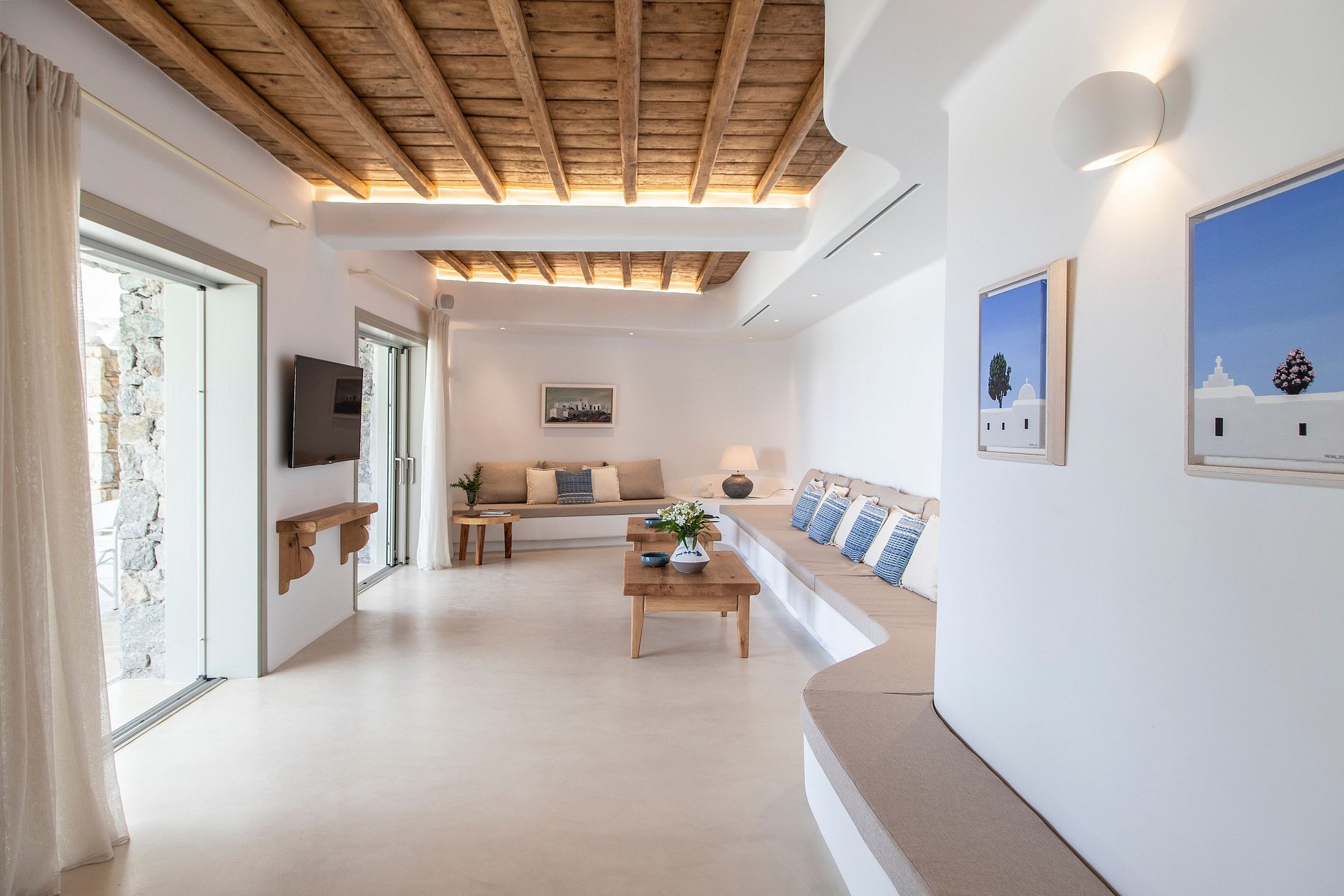 Its interior design, which boasts a chic island-modern style, is a harmonious blend of traditional Cycladic architecture and contemporary luxury.