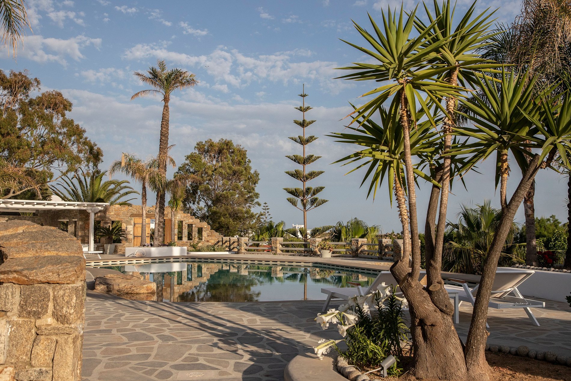 Despite being situated in the bustling island of Mykonos, it provides a tranquil haven that is ideal for families and anyone seeking a peaceful holiday. The villa's expansive outdoor area and magnificent views of the Aegean Sea, coupled with its secluded, beach-like pool, offer an unforgettable lifestyle experience to guests. Additionally, the villa is well-suited for hosting various types of events, including weddings and parties, as it is easily accessible via a paved road.