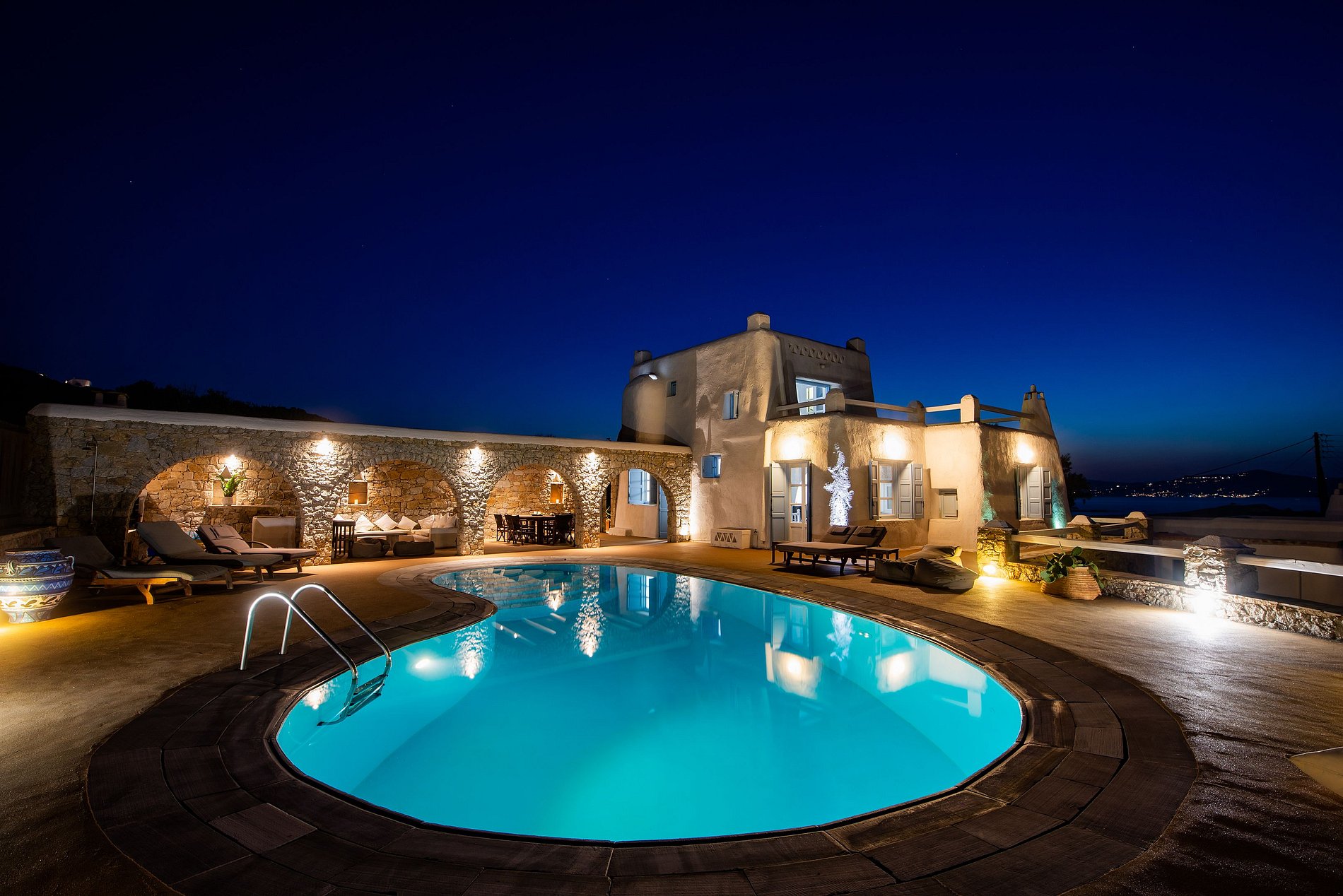 This villa is an exclusive luxury property located in the southern, upscale area of Kanalia in Mykonos, situated on a unique seaside spot. The villa offers breathtaking panoramic views of the Aegean Sea, Mykonos Town and Delos Island.