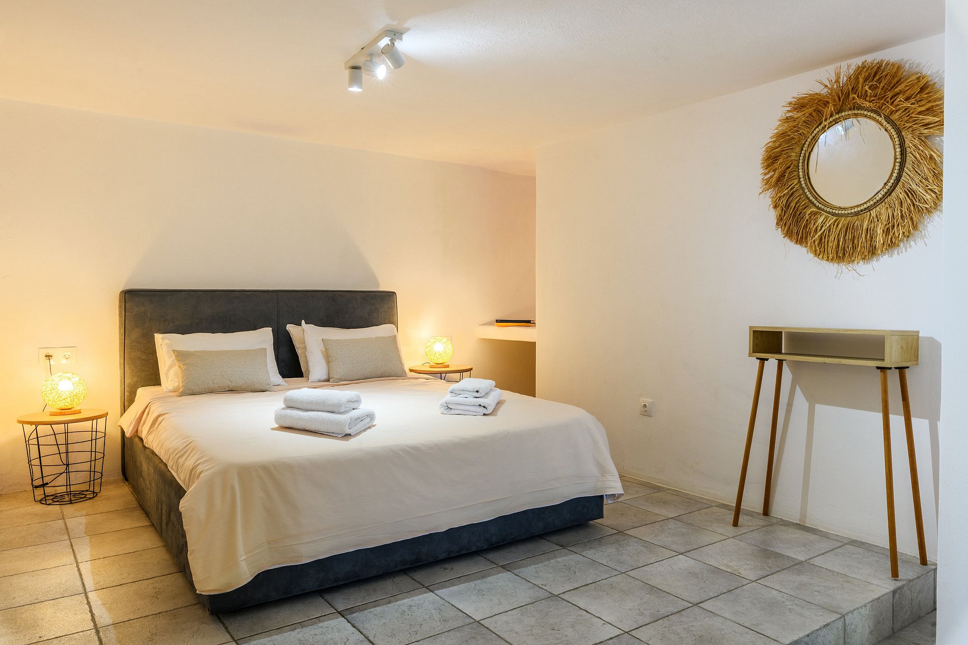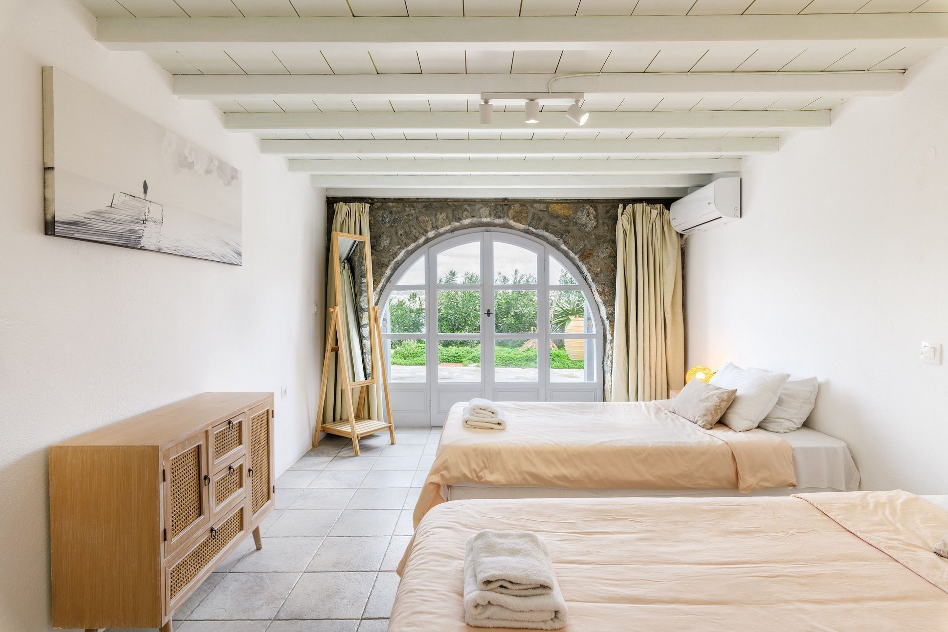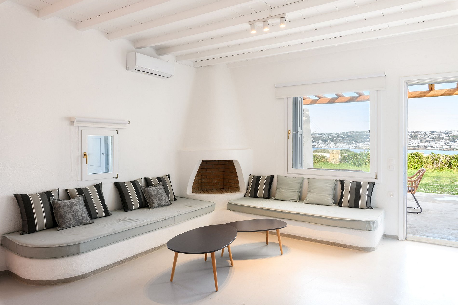 The villa's interior design is influenced by traditional elements, featuring bright white colors, natural stones, and decorative details. The use of natural materials and simple geometric shapes creates a tranquil and breezy atmosphere, offering fashionable elegance and absolute comfort.