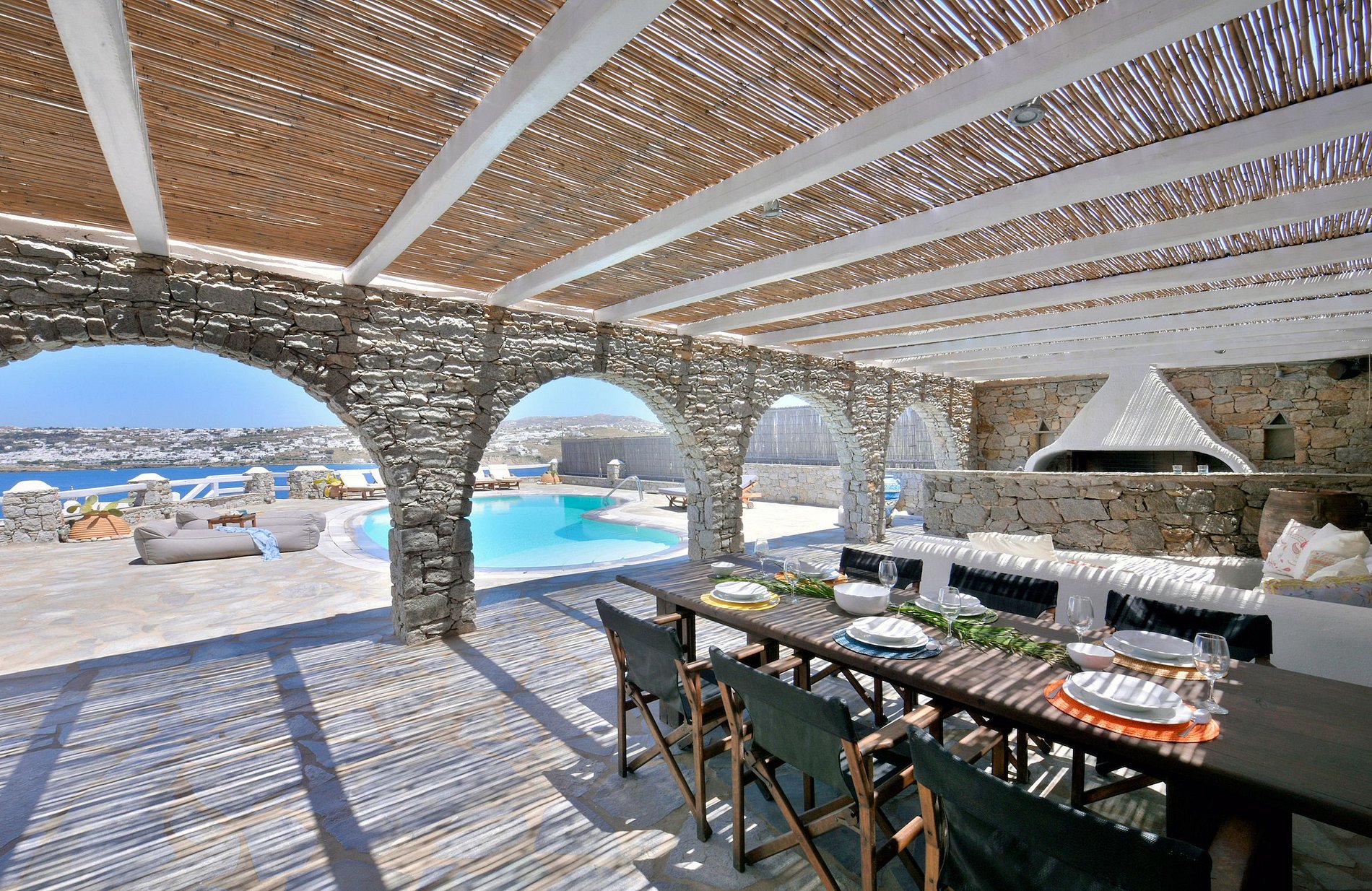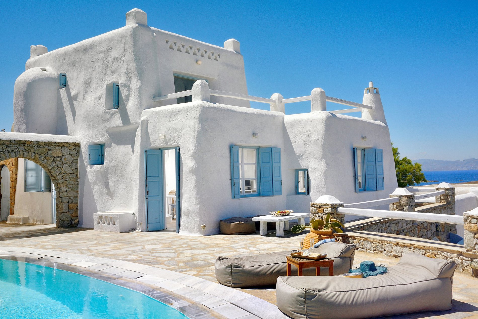 This villa is an exclusive luxury property located in the southern, upscale area of Kanalia in Mykonos, situated on a unique seaside spot. The villa offers breathtaking panoramic views of the Aegean Sea, Mykonos Town and Delos Island.