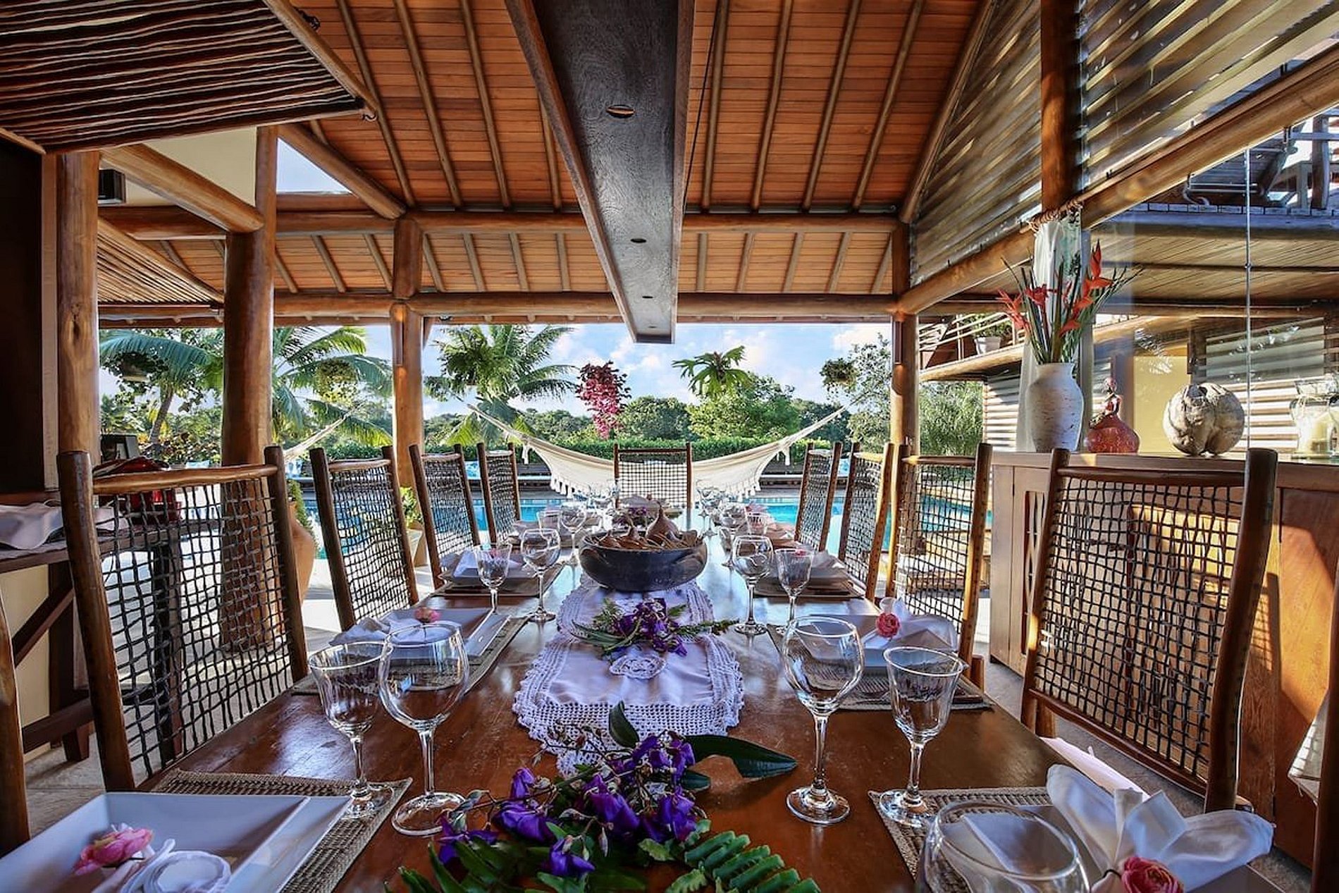 The immense swimming pool, the hammocks under a tropical sundeck and the big palm trees emerging from the exotical vegetation of the garden will make you let forget all the stress and worries of everyday life immediately.