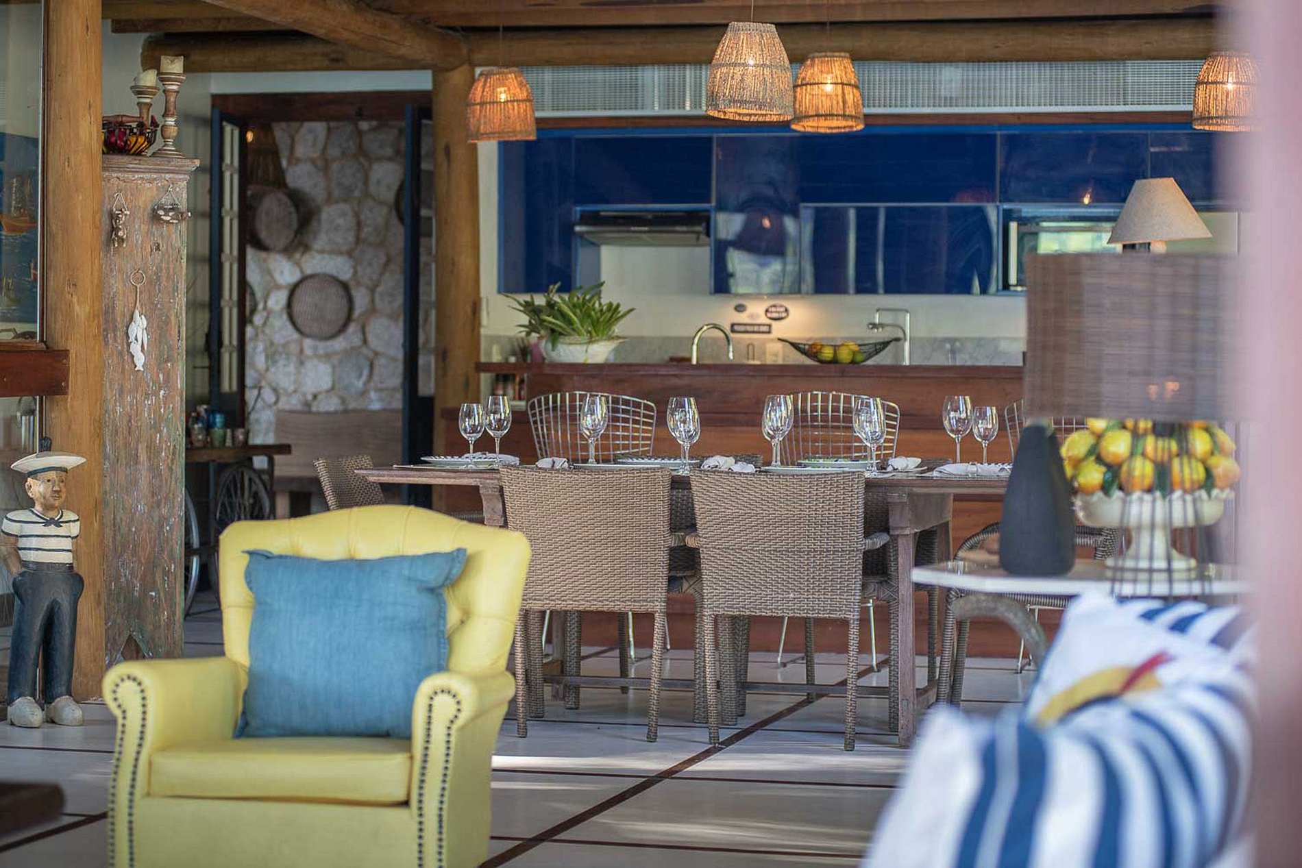 The decor features pieces picked up by the family in nautical antique shops for over 50 years, such as original ship compasses, diving suits and imitations of English sailing boats, mixed with navy colors and tropical themes. The living room is integrated into the kitchen, which in turn is connected to a new outdoor gourmet area. The second kitchen has all Viking brand equipment, aiming to deliver the best to food lovers. Also part of the gourmet kitchen is a classic Berkel 1920, known as "the most beautiful and classic slicer of cold cuts in the world", which also works as a decoration piece.