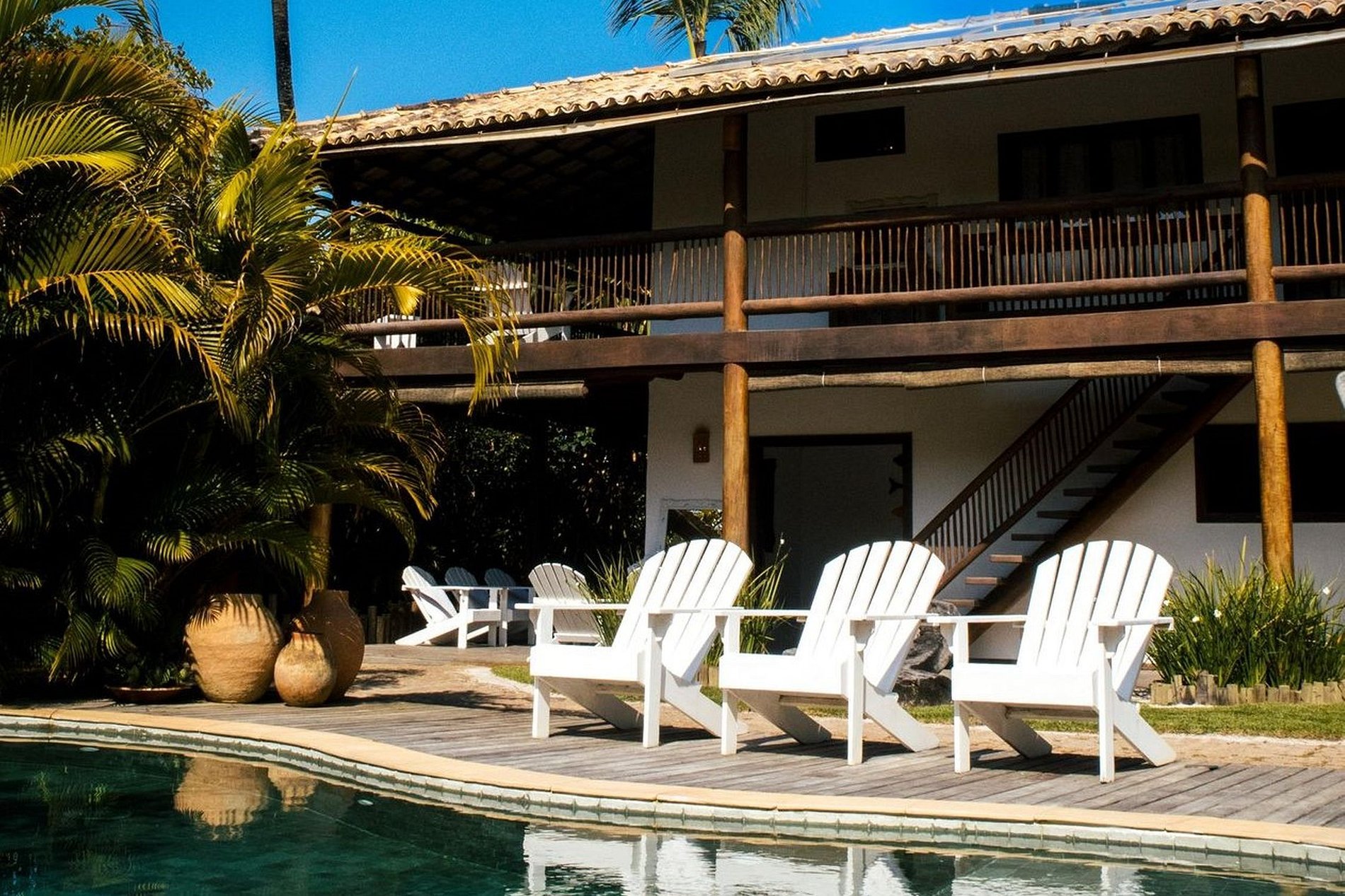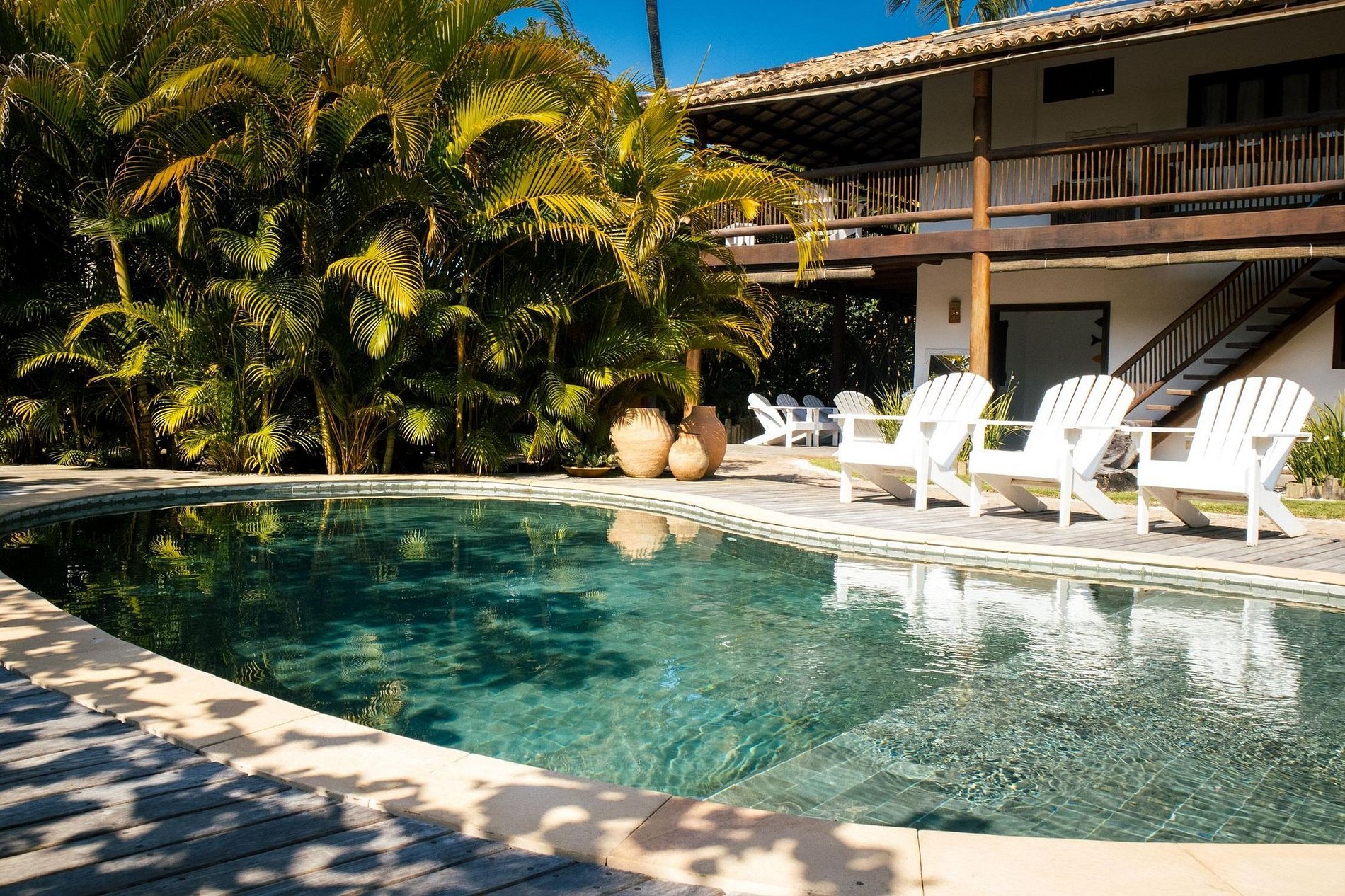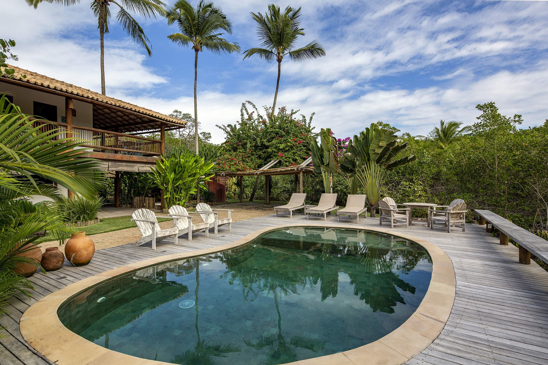 Next to the mangrove is the curved pool and an invitation to enjoy the sunny days of southern Bahia. The gourmet area and terraces around the house are more pleasant places for privileged moments with family and friends.